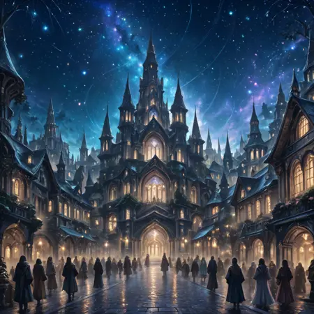トリガー言語: 超自然的なナイトシティ、ファンタジーシティ、(夜)、(星空)、鮮やか、詳細