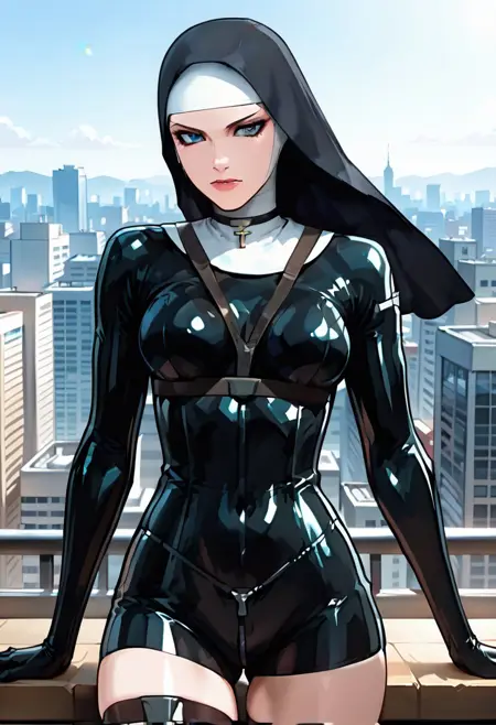 heather,1名女性,修女面纱,头罩,深V连体衣,腰带,系带靴子