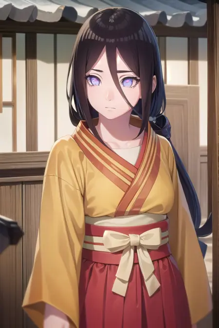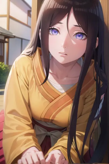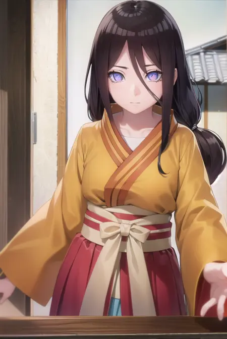 하나비 히유가, 긴 머리, 검은 머리, 눈 사이의 머리, 하얀 눈동자, 동공 없음,