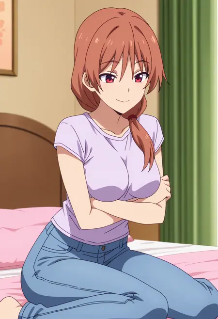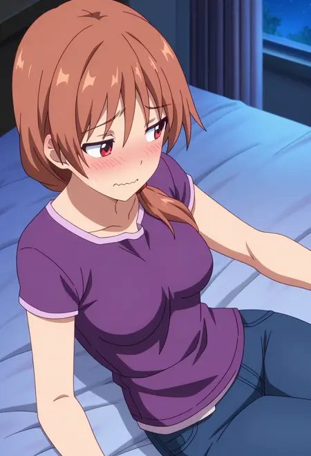 - yoshieww, 성숙한 여성, 빨간 눈, 갈색 머리, 긴 머리, 낮은 팔머리, 머리끈, 어깨에 걸린 머리