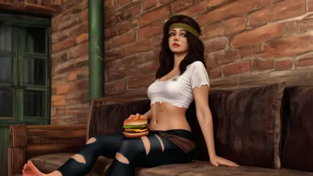 下着: 破れたズボン、ベルト、バックル、素足、足の指、黒いズボン、破れた脚部、太ももバンド、キーリング、ポーチ、ホルスター、ノースリーブ、タンクトップ、お腹、黒い手袋、指なし脚部