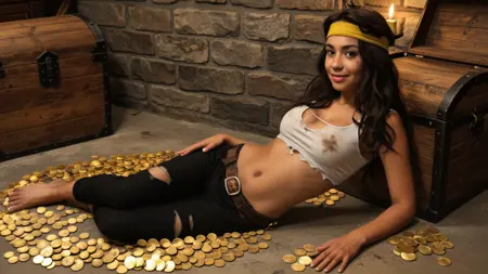 汎用: タリーナ、1girl、solo、長い髪、ジュエリー、ネックレス、ゴールデンネックレス、茶色の髪、黄色い目、日焼けした肌、濃い肌、傷、複数の傷、そばかす、スカーフ、茶色のスカーフ、ヘッドバンド、緑/黄色のヘッドバンド、唇、汚れた、汚れた肌、泥まみれ、中程度の胸、前髪、引き締まった、スポーツ選手のような、