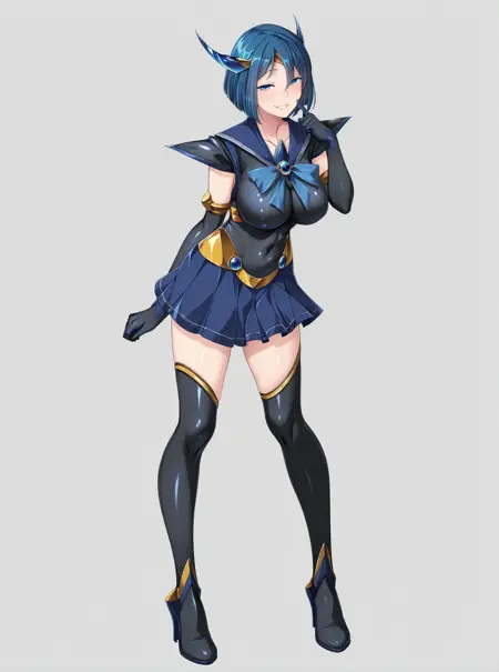 sailoraqua_服装,头饰,蓝色水手领,金色镶边,白色肩垫,白色紧身衣,蓝色胸针,水色丝带,蓝色短裙,白色长筒靴,白色肘套,蓝色手掌,蓝色鞋底,白色长筒靴,高跟鞋,