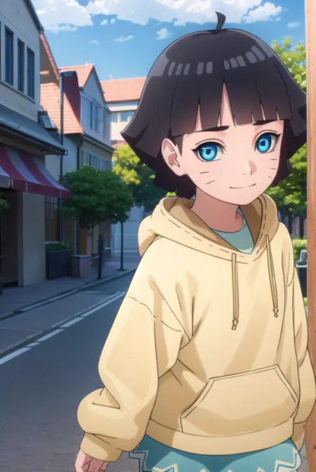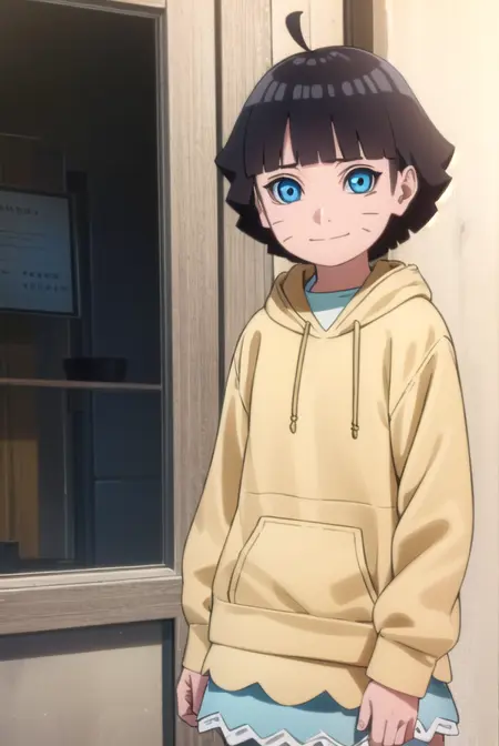 himawari uzumaki、短い髪、前髪、青い目、黒髪、まっすぐな前髪、顔の模様、ひげ模様、ahoge、