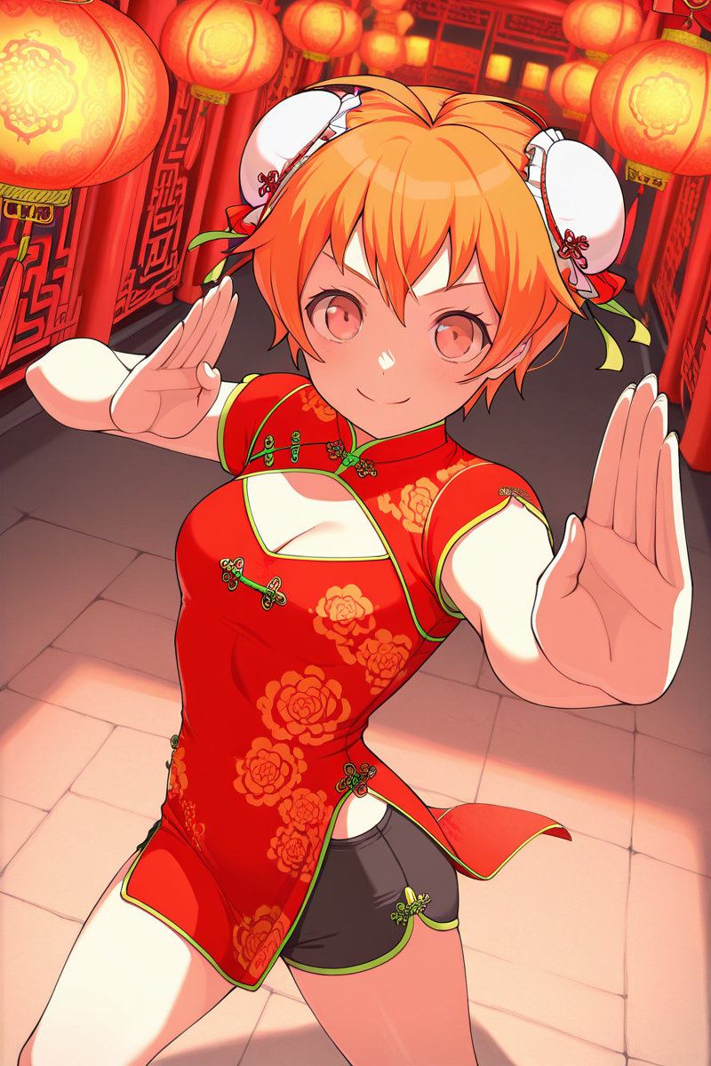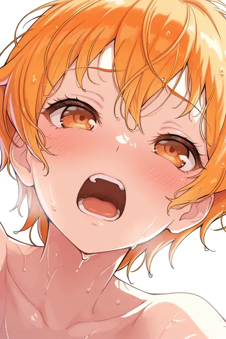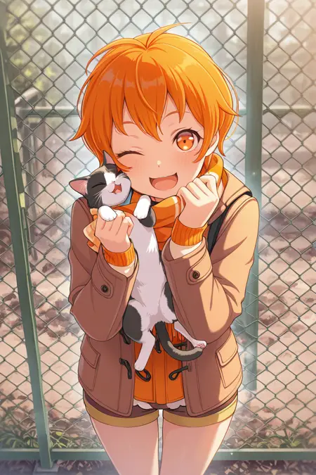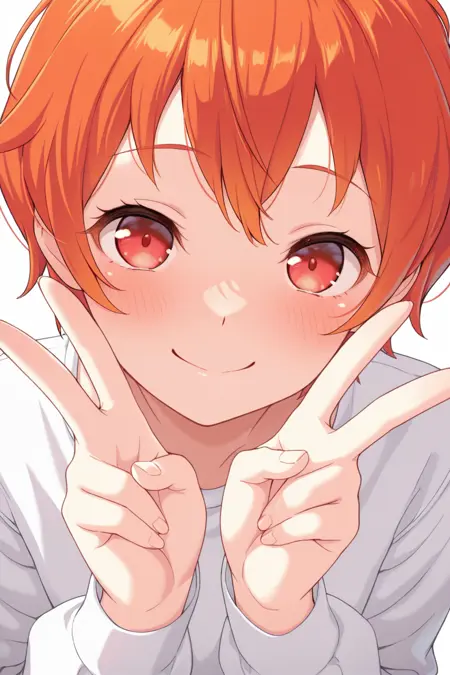 kitazawahagumi, 1girl, solo, orange hair, school uniform, smile, short hair, double-breasted, looking at viewer, buttons, red ribbon, ribbon, long sleeves, sailor dress, dress, white sailor collar, sailor collar, ahoge, brown dress, neck ribbon, hanasakigawa school uniform, pleated dress