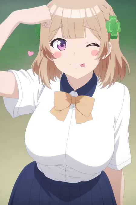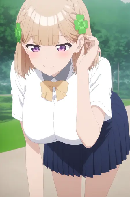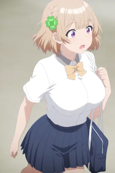 kurohashida, short hair, purple eyes, flower-shaped hair ornament, four-leaf clover hair ornament, light brown hair, large breasts, short girl,