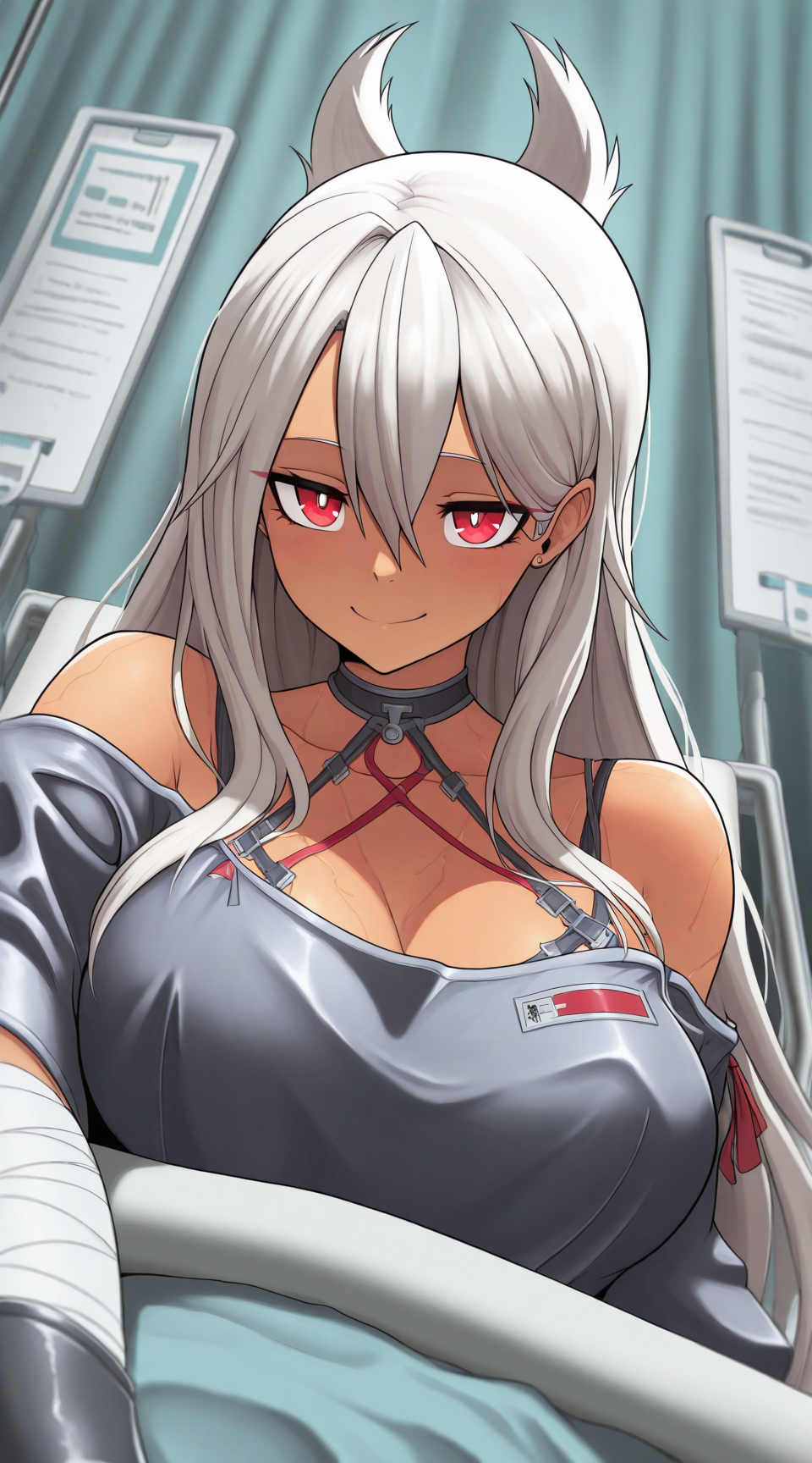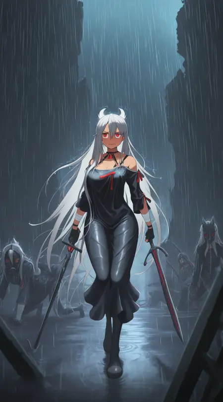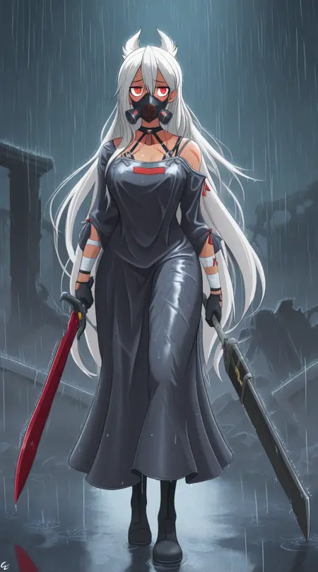 標準的な外見用プロンプト:cruz_silva, black_dress, red_tube, bandaged_arm, red_eyes