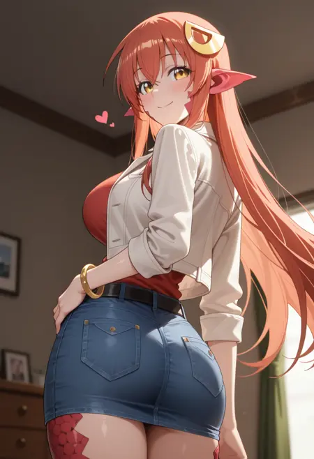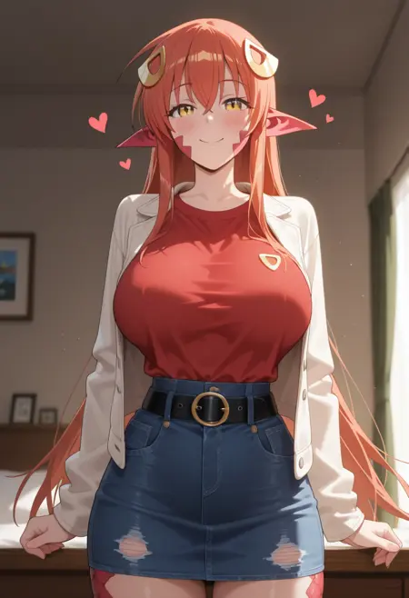 トリガーワード(衣装):赤いTシャツ、デニムスカート、バックル、ベルト、ブレスレット、白いジャケット