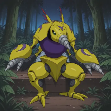 Tags: digimon (creature), insect, armor, purple markings, yellow body, armored body, drills, drill nose, multi arm, four arms, green eyes, antennae, insect wings, two toes,