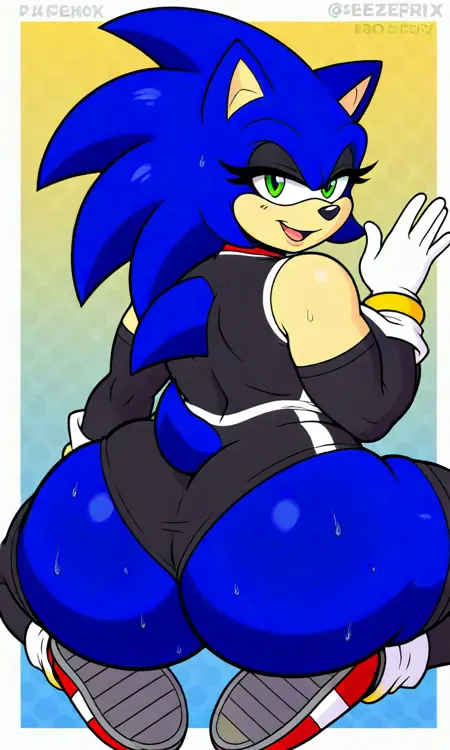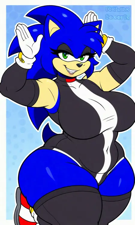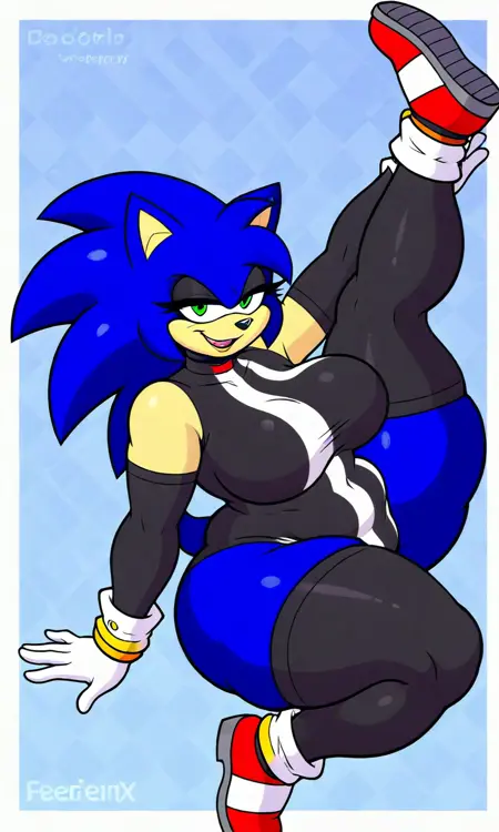 タグ: fakeErix, ハリネズミ, 青い毛並み, 緑の目, 白い手袋, 赤い靴, 黒いレオタード, 黒い太ももハイ, 黒い腕カバー, 黄色のリング手袋
