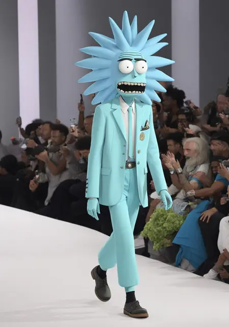 変なファッションショーの衣装、司会者、スタイルを生成してください。