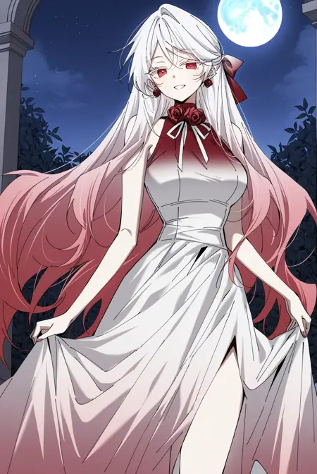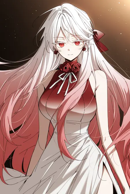 비옌, 1소녀, 솔로, 빨간 눈, 그라데이션 헤어, 흰색 머리, 분홍색 머리, 긴 머리, 불균형한 앞머리, 긴 앞머리, 눈 사이의 머리카락, 긴 옆머리, 어깨를 덮는 머리카락, 반쯤 올린 헤어스타일, 파도 모양의 머리카락, 풀린 머리카락, 큰 헤어 리본, 붉은 헤어 리본, 붉은 귀걸이, 드롭 귀걸이, 장미 귀걸이,