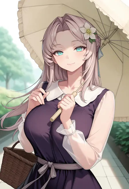 Mnem00ne,长发,发饰花朵,Aqua色眼睛,分刘海,紫色连衣裙,长袖,透明袖子,凉鞋,雨伞,篮子,