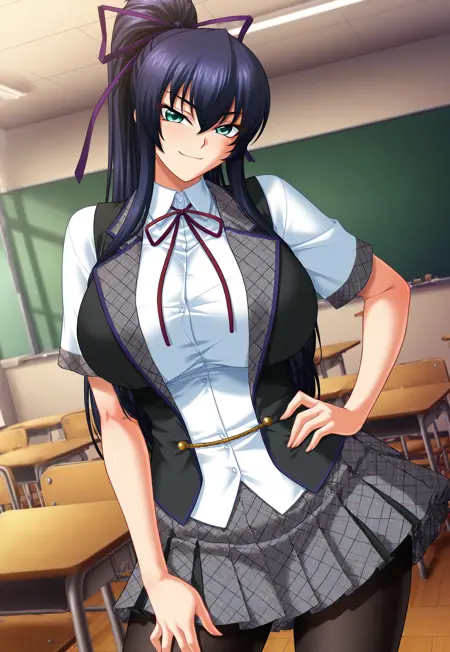 标签:1girl,闪亮肌肤,曲线美,池上椿,黑发,长发,高马尾,紫色发带,绿眼,吊眼,大乳房