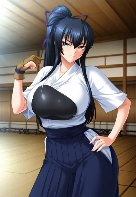 태그: 1소녀, 윤기 나는 피부, 곡선미, 이케가미ツバキ, 검은 머리, 긴 머리, 높은 토끼꼬리, 보라색 머리리본, 녹색 눈, 눈꼬리 올라감, 큰 가슴