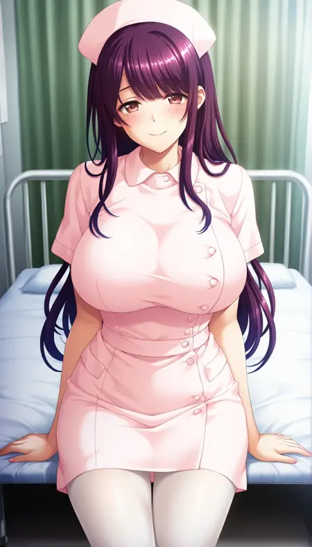 春岡かずさ、パープルの髪、ロングヘア、茶色の瞳