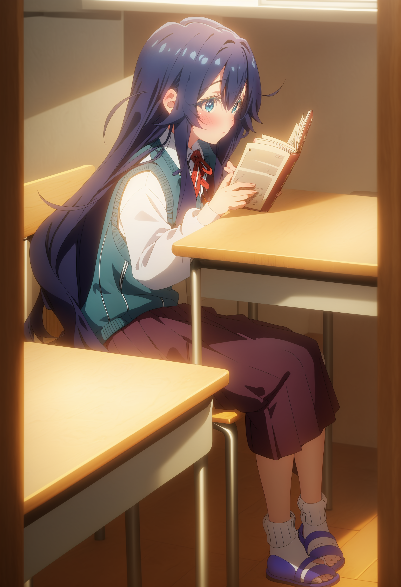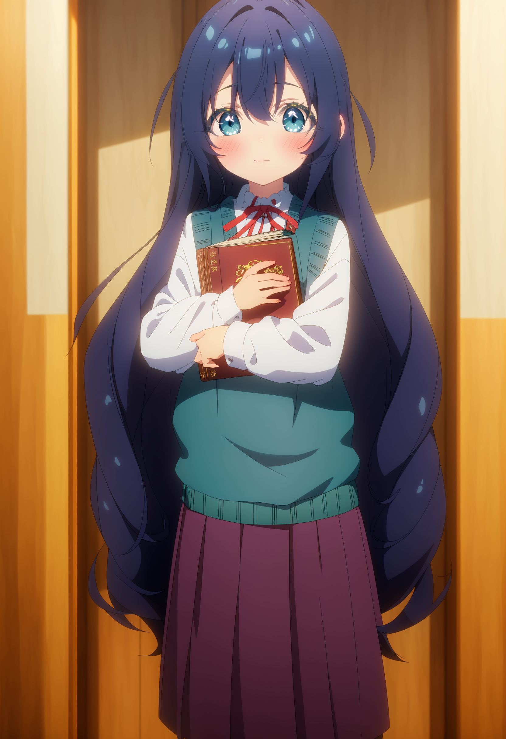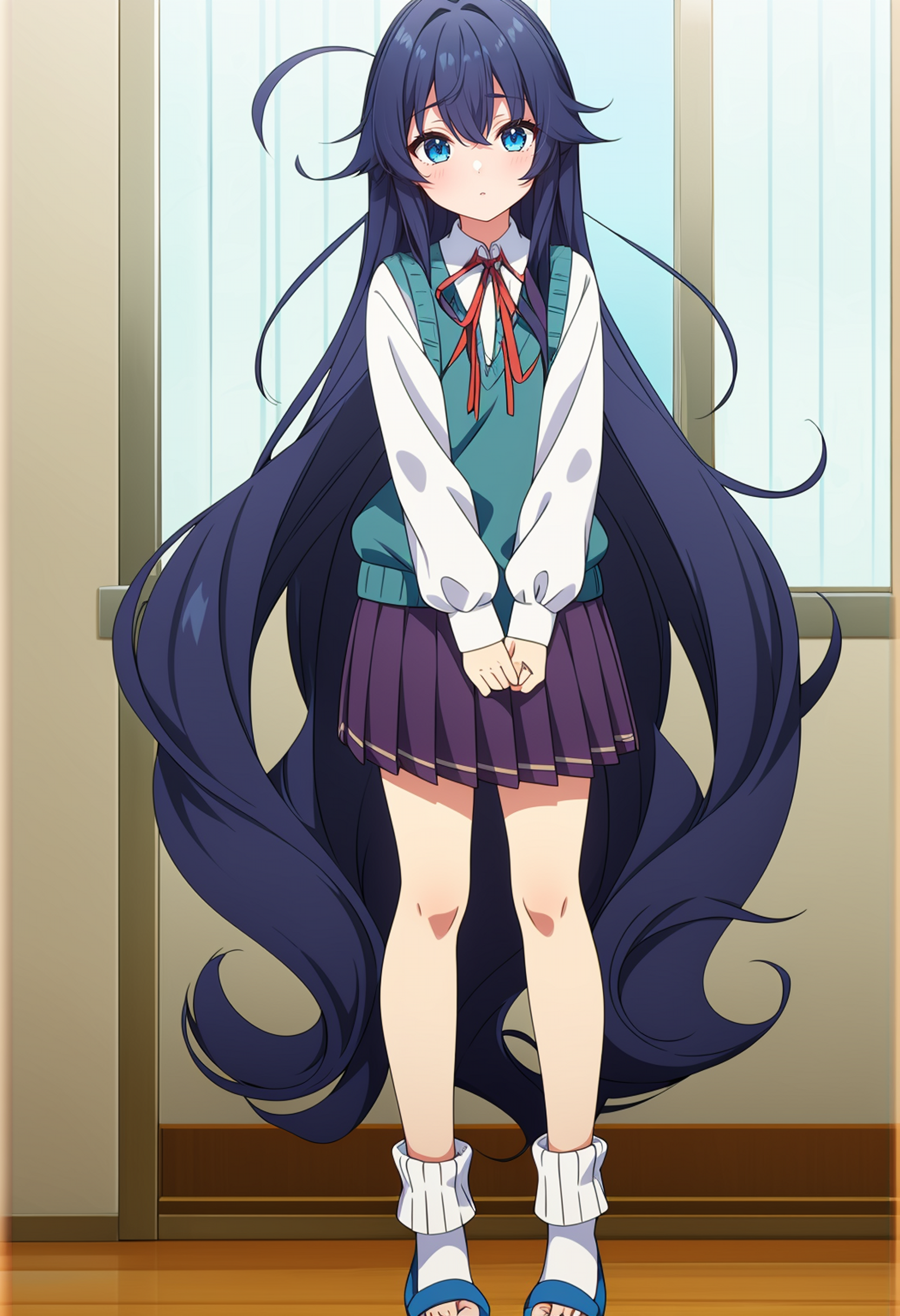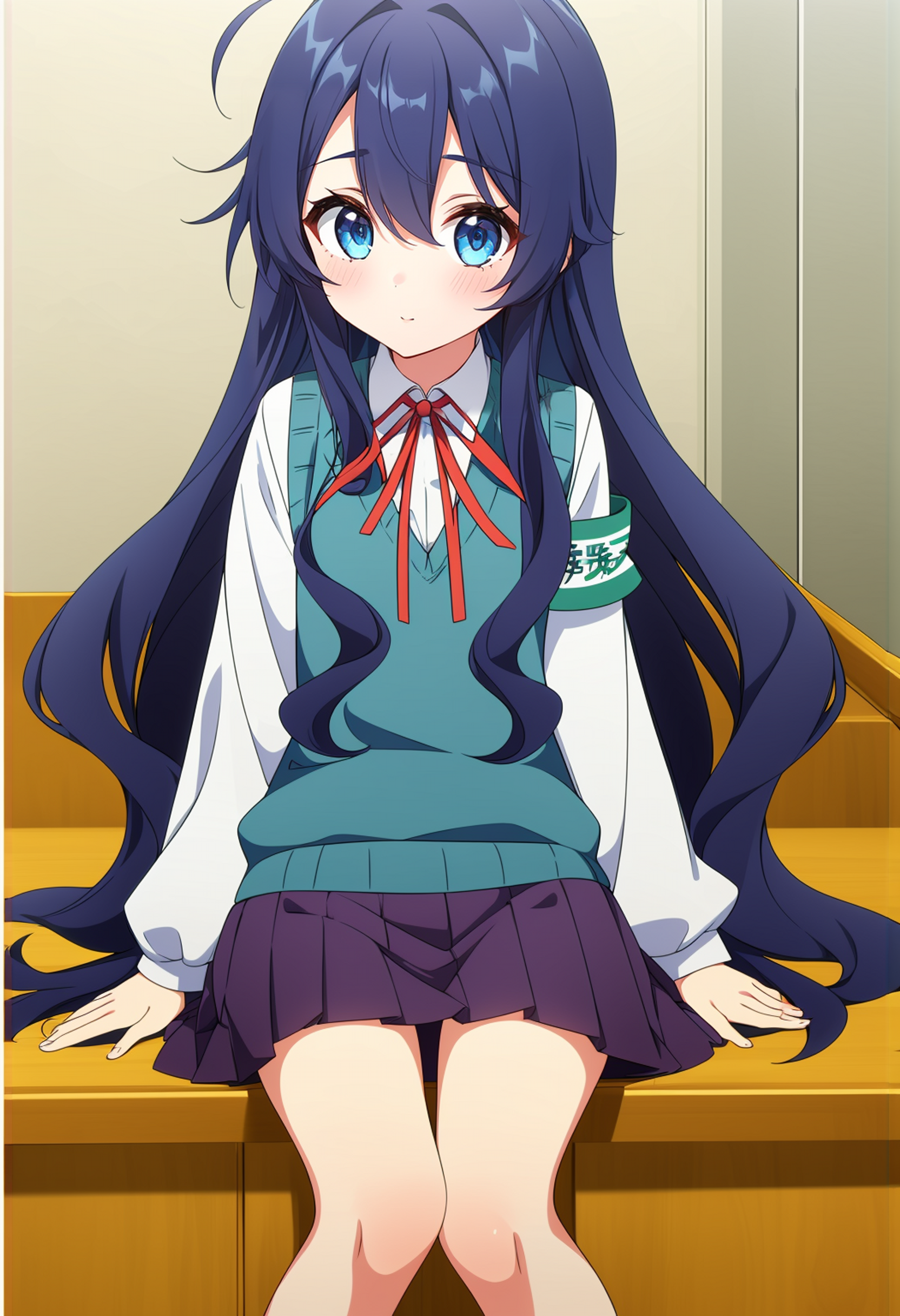 校服:haobenjingxiaofu,hair intakes,red neck ribbon,collared shirt,long sleeves white shirt,school armband,blue sweater vest,purple pleated skirt,