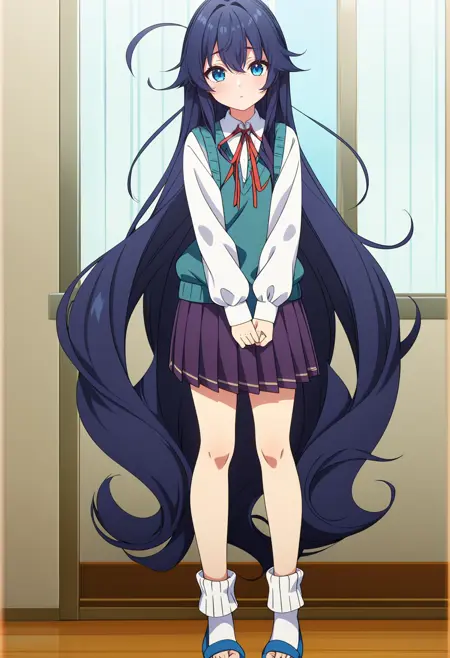 1girl,solo,loli,long hair,very long hair,blue hair,dark blue hair,messy hair,sidelocks,bangs,blue eyes,