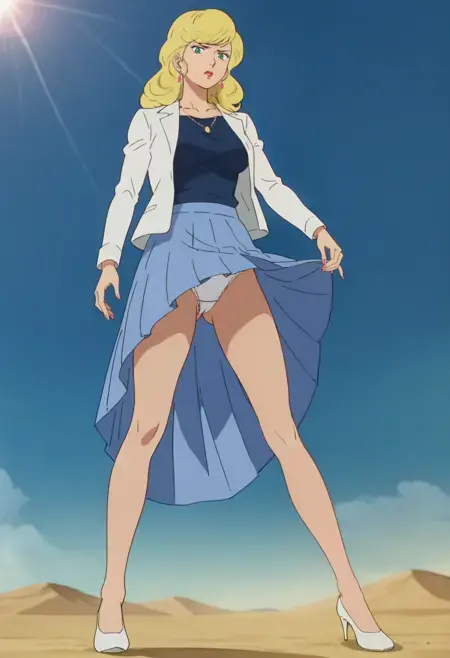 ピンクのイヤリング、ゴールドのネックレス、オープンジャケット、白いジャケット、青いシャツ、青いスカート、プリーツスカート、ロングスカート、白いハイヒール