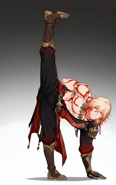 追加タグ: 足を上げる、片足を上げる、手を背中に回す、立っている、立ち姿勢のスプリット、片足で立つ、全身、