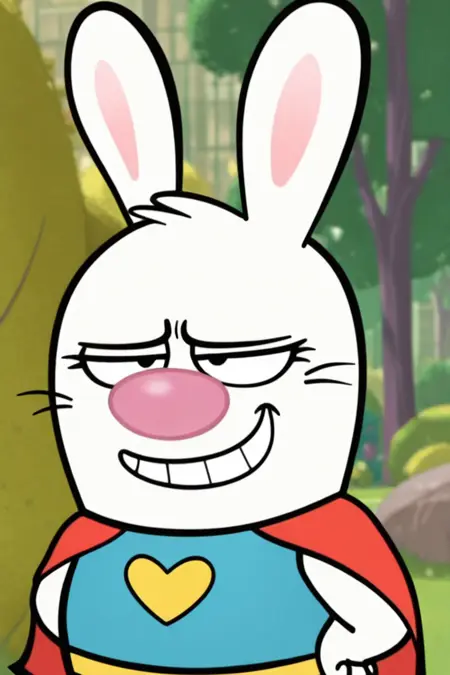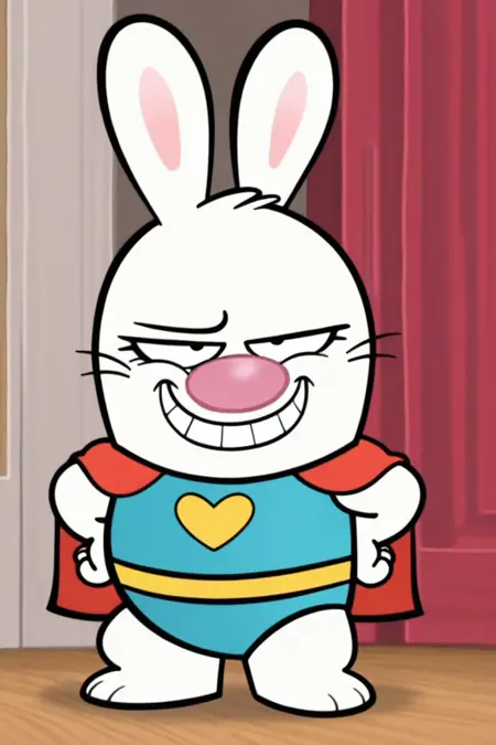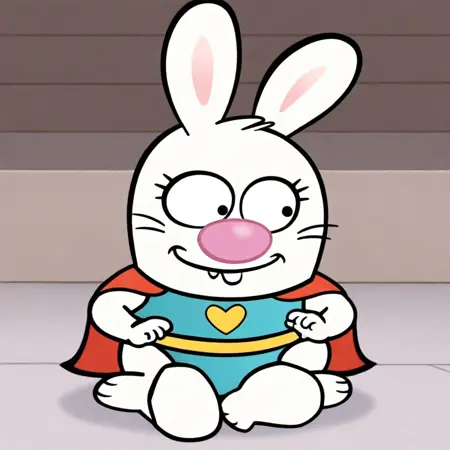 프롬프트: Superbuns illus, solo, 1girl, bunny, anthropomorphic bunny, black eyes, pink nose, whiskers, bunny ears, buck teeth, paw, barefoot, blue leotard, red cape, gold heart logo, gold belt