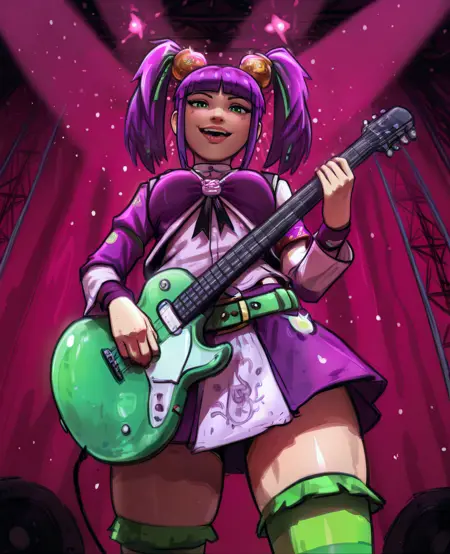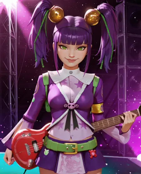 紫色夹克,粉色衬衫,腰带,迷你裙或裙子,臂带,条纹大腿袜,紫色高跟鞋,黑色内衣,背包或粉色背包,