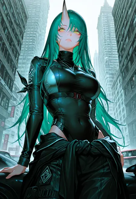 黄色い目、緑の髪、長い髪、右額に一本の角、