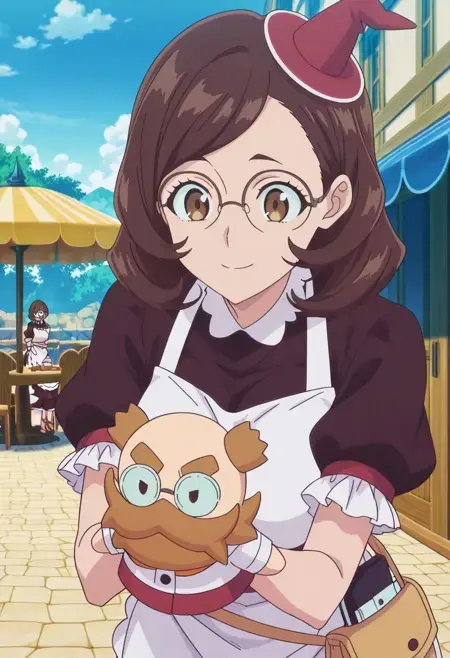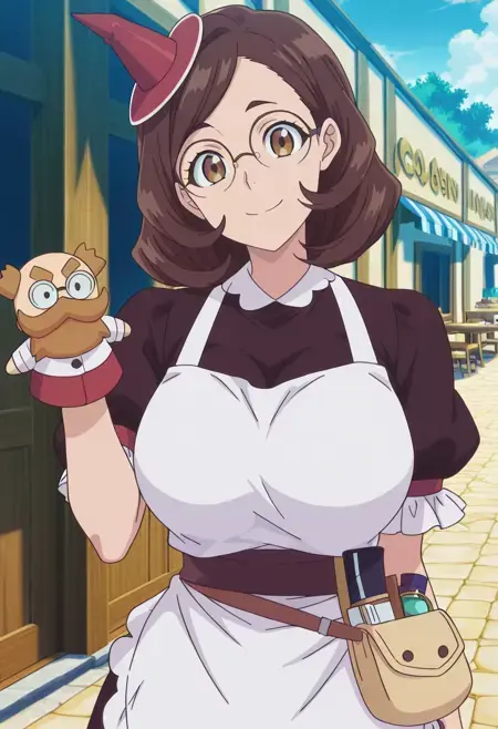 MissMelvaWaitress, 1girl, solo, brown hair, medium hair, brown eyes, round glasses, large breast, large hips, red mini hat, puffy short sleeves, dark brown waitress dress, ankle-length dress, white maid apron, side bag, frills, character doll on hand, 1 hand puppet on right hand, brown shoes, high heels,