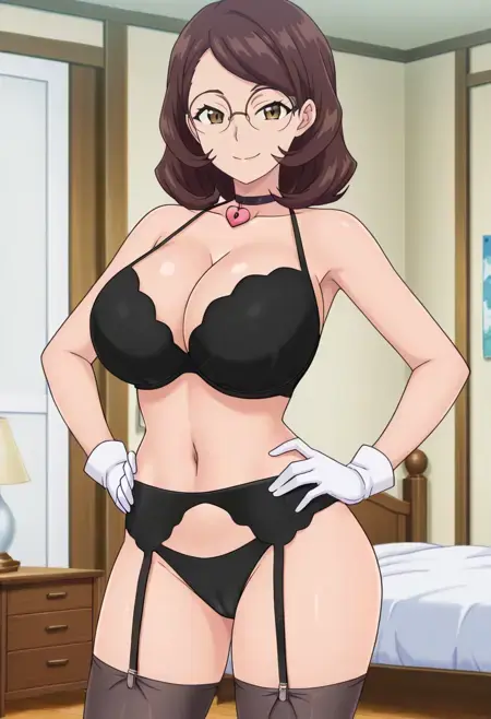 MissMelvaLingerie, 1girl, solo, brown hair, medium hair, brown eyes, round glasses, lingerie, black thighhighs, large breast, large hips, heart-shaped lock choker, bare shoulders, collarbone, black panties, white gloves, black bra, cleavage, black garter belt, black straps, navel, cameltoe, high heels, elegant shoes,