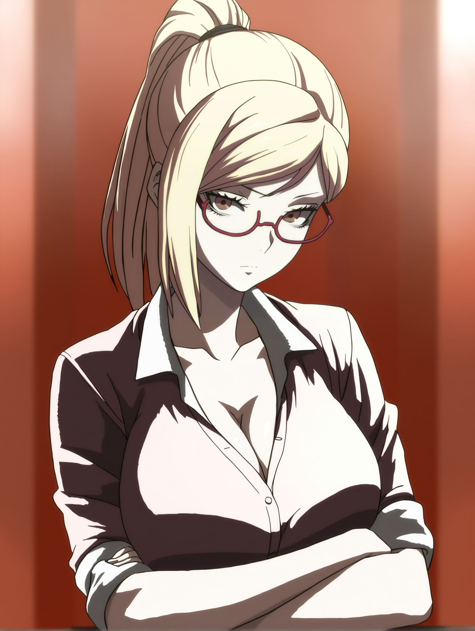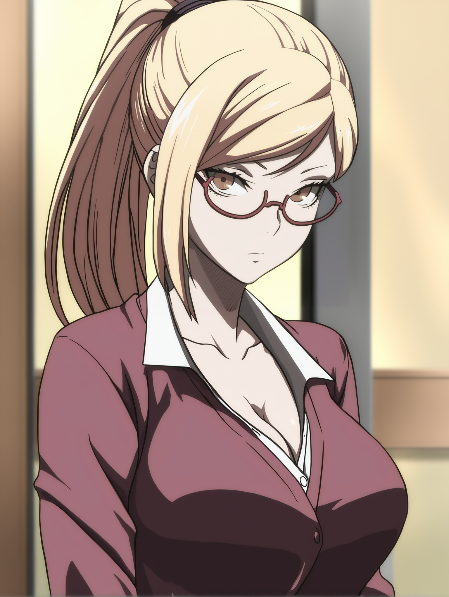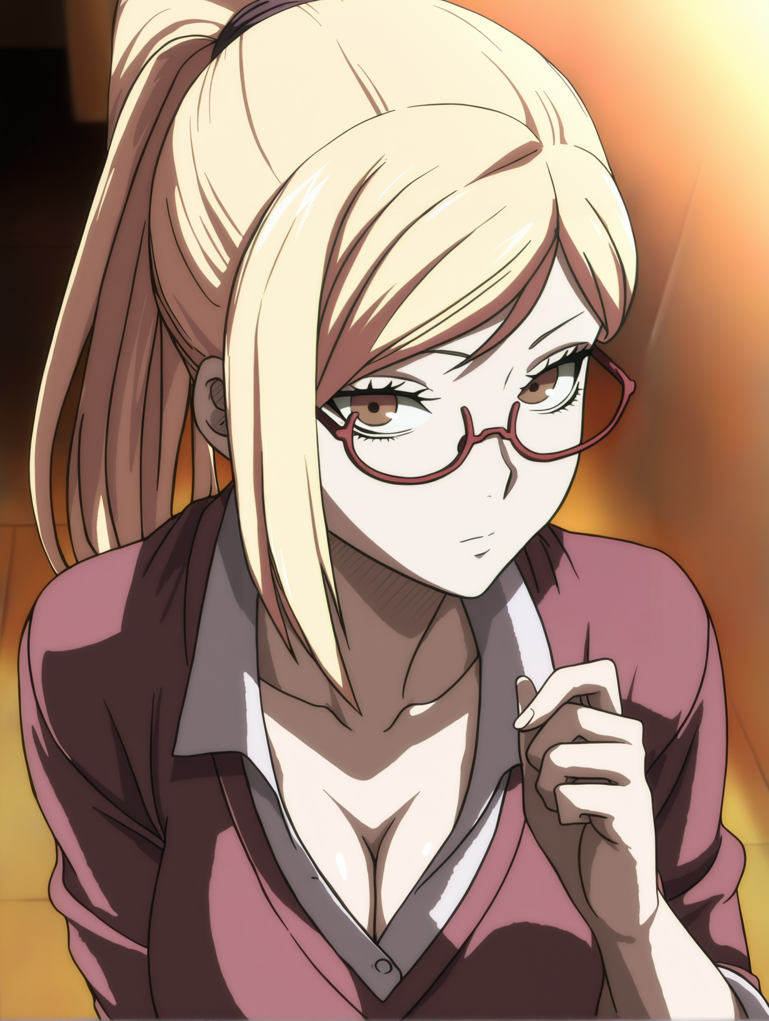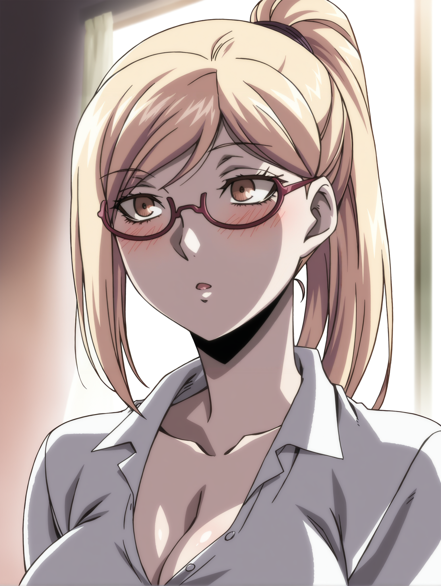 IL_Akiyama Kaede,1girl,solo,glasses,red-framed eyewear,semi-rimless eyewear,under-rim eyewear,breasts,large breasts,cleavage,long hair,high ponytail,blonde hair,swept bangs,brown eyes,eyelashes