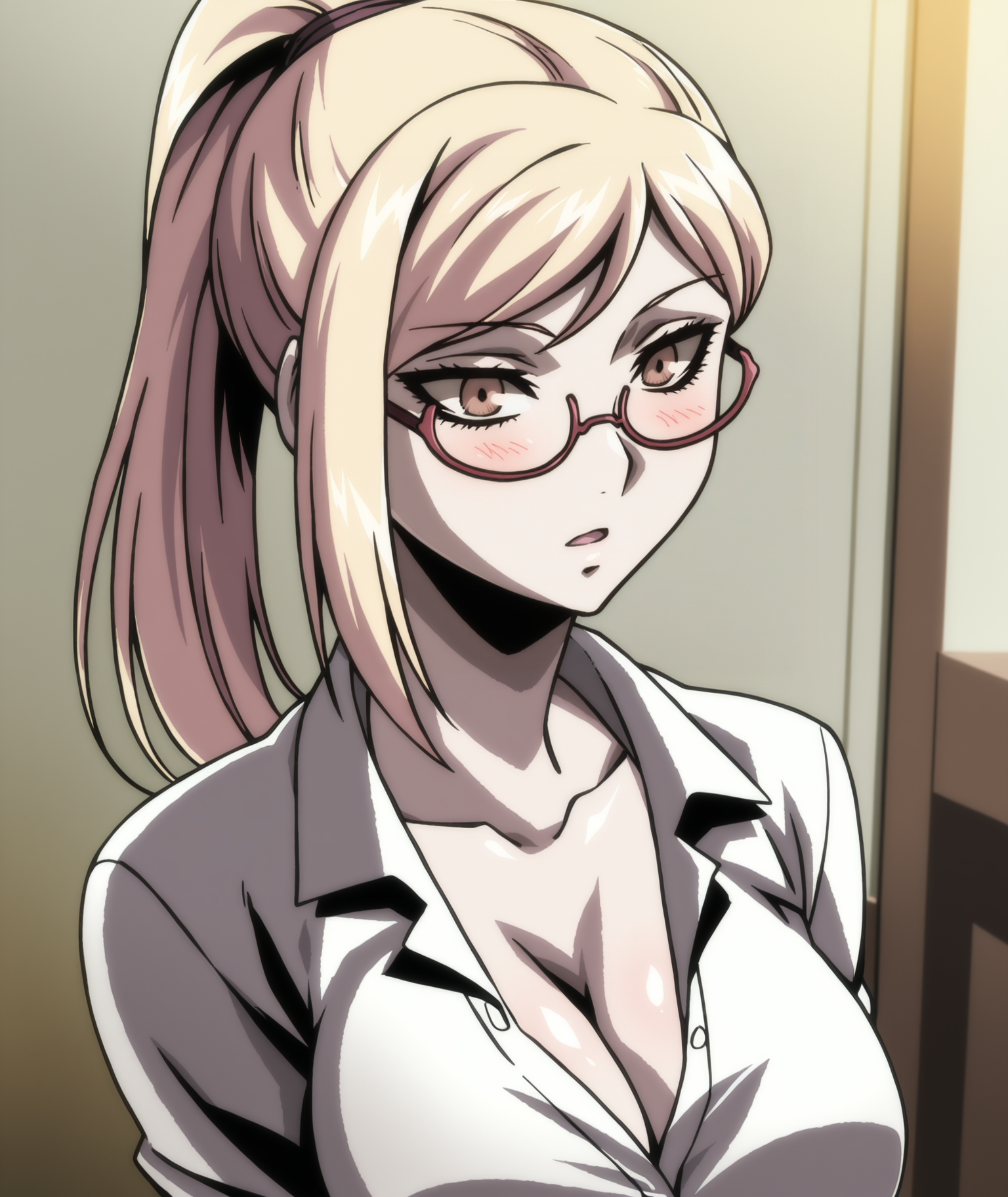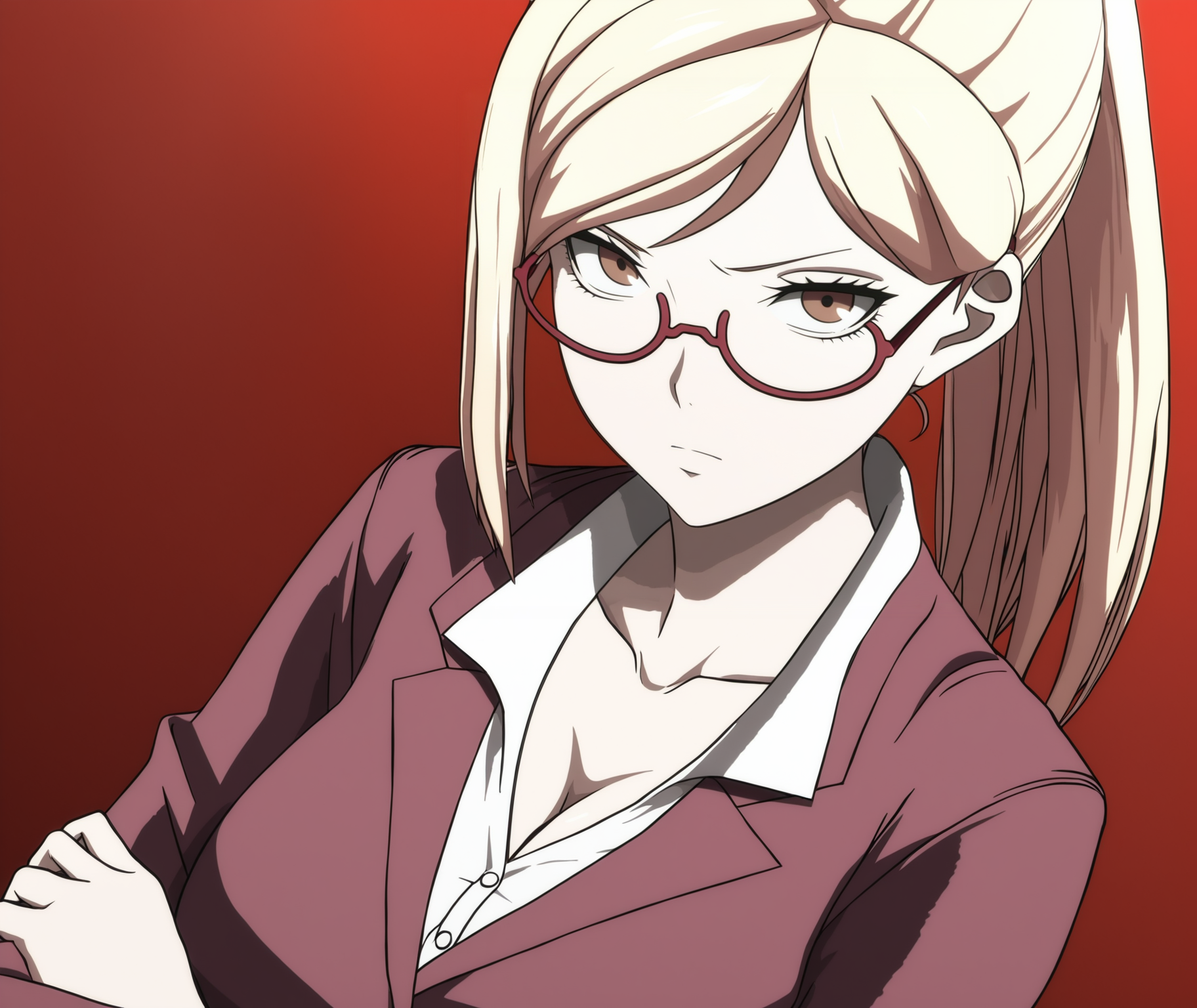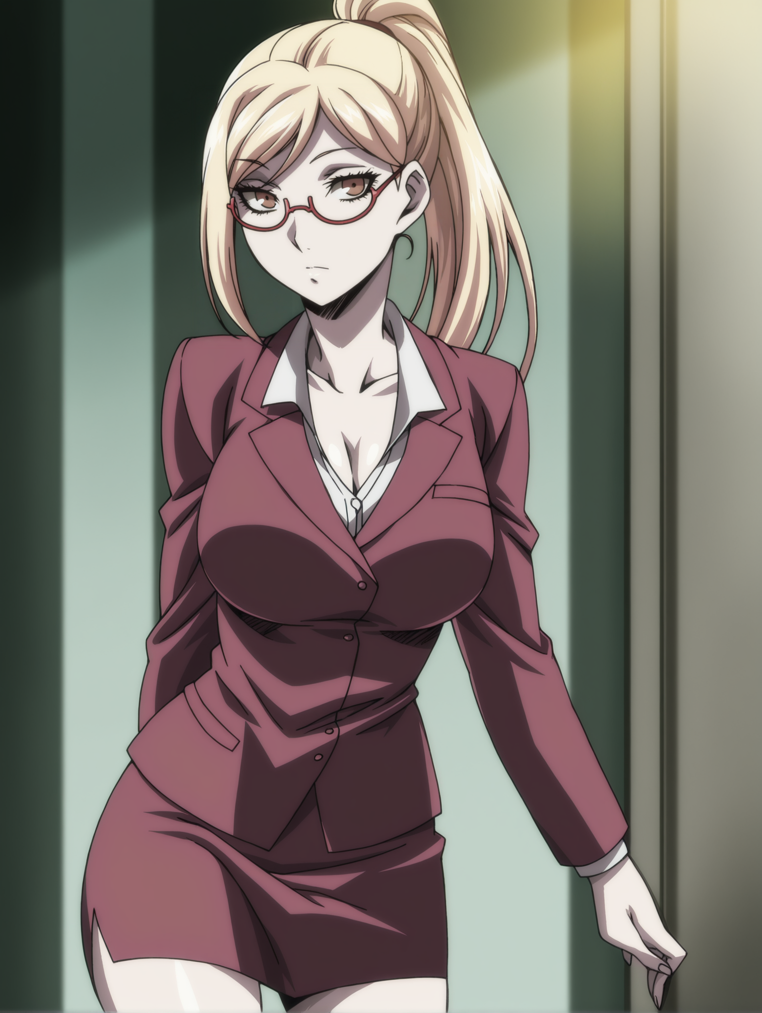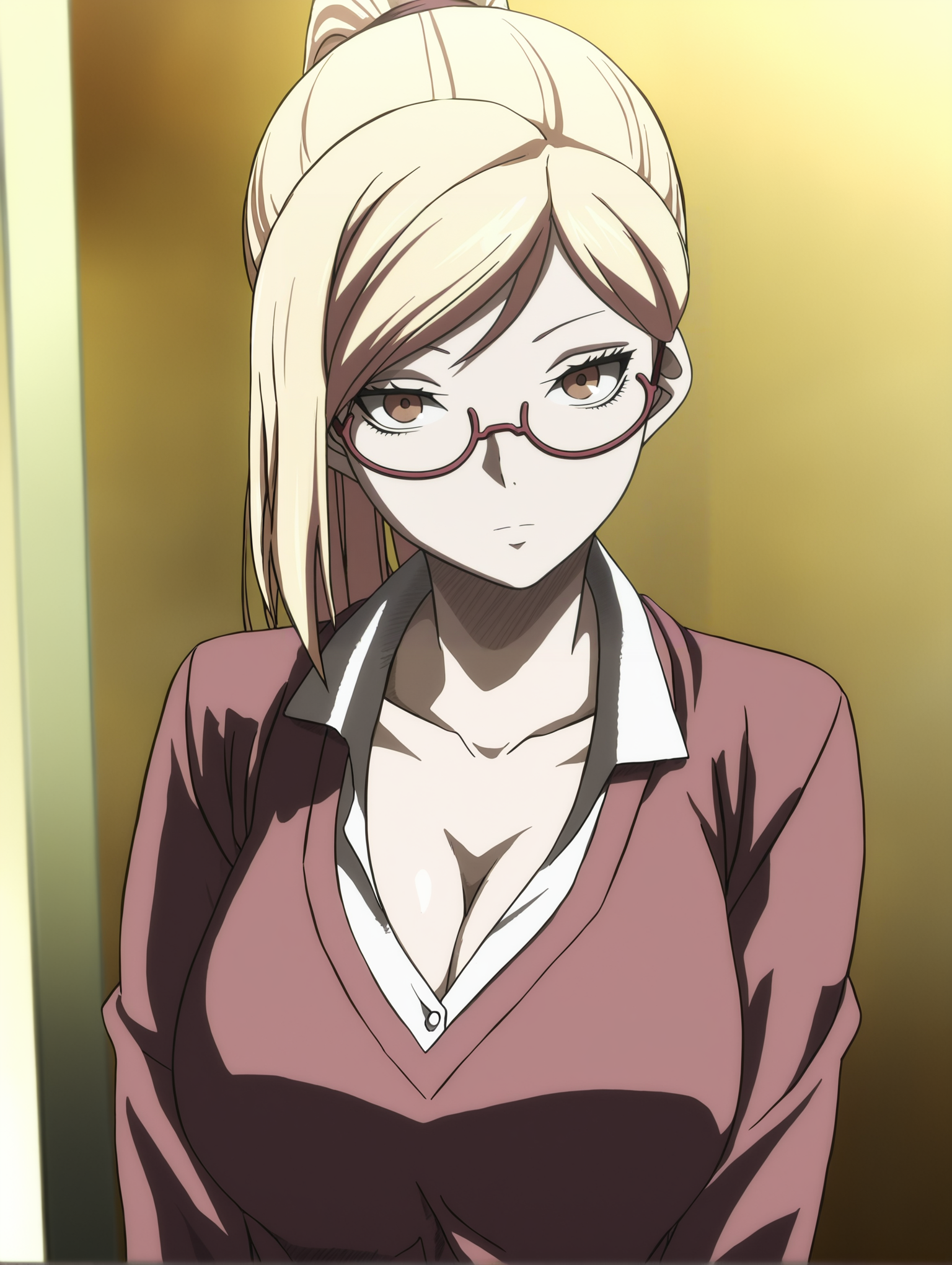 IL_Akiyama Kaede,1girl,solo,glasses,red-framed eyewear,semi-rimless eyewear,under-rim eyewear,breasts,large breasts,cleavage,long hair,high ponytail,blonde hair,swept bangs,brown eyes,eyelashes