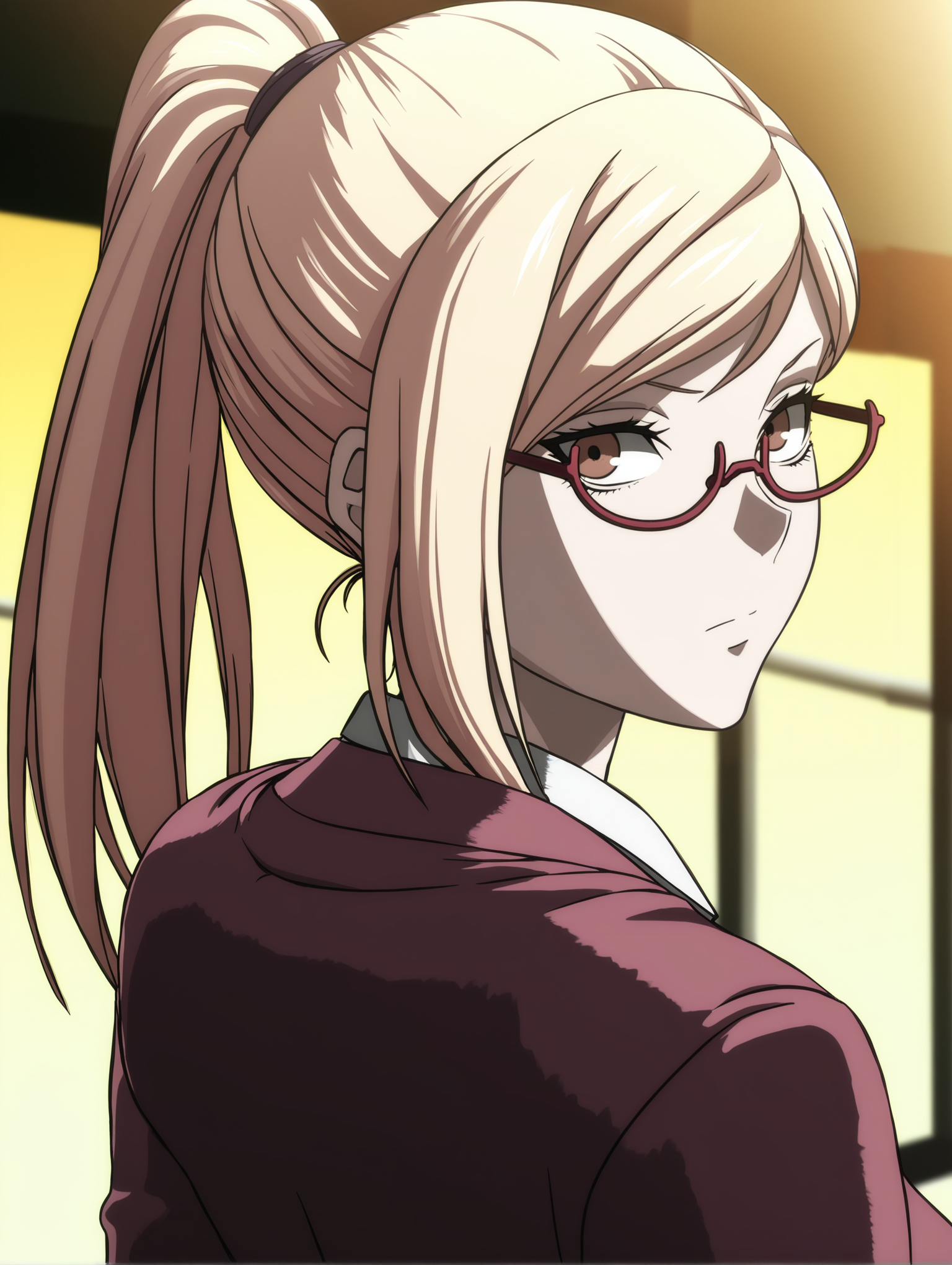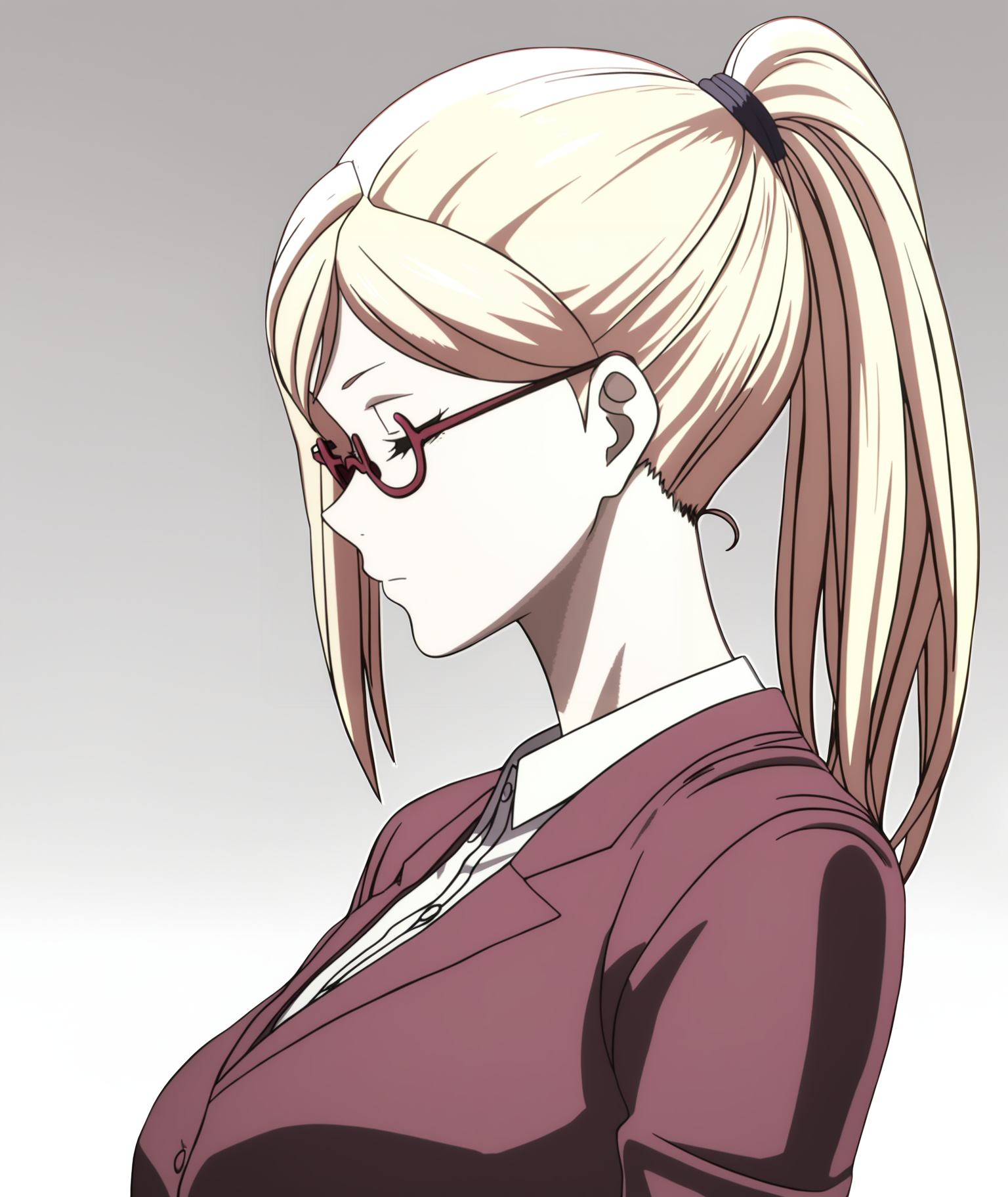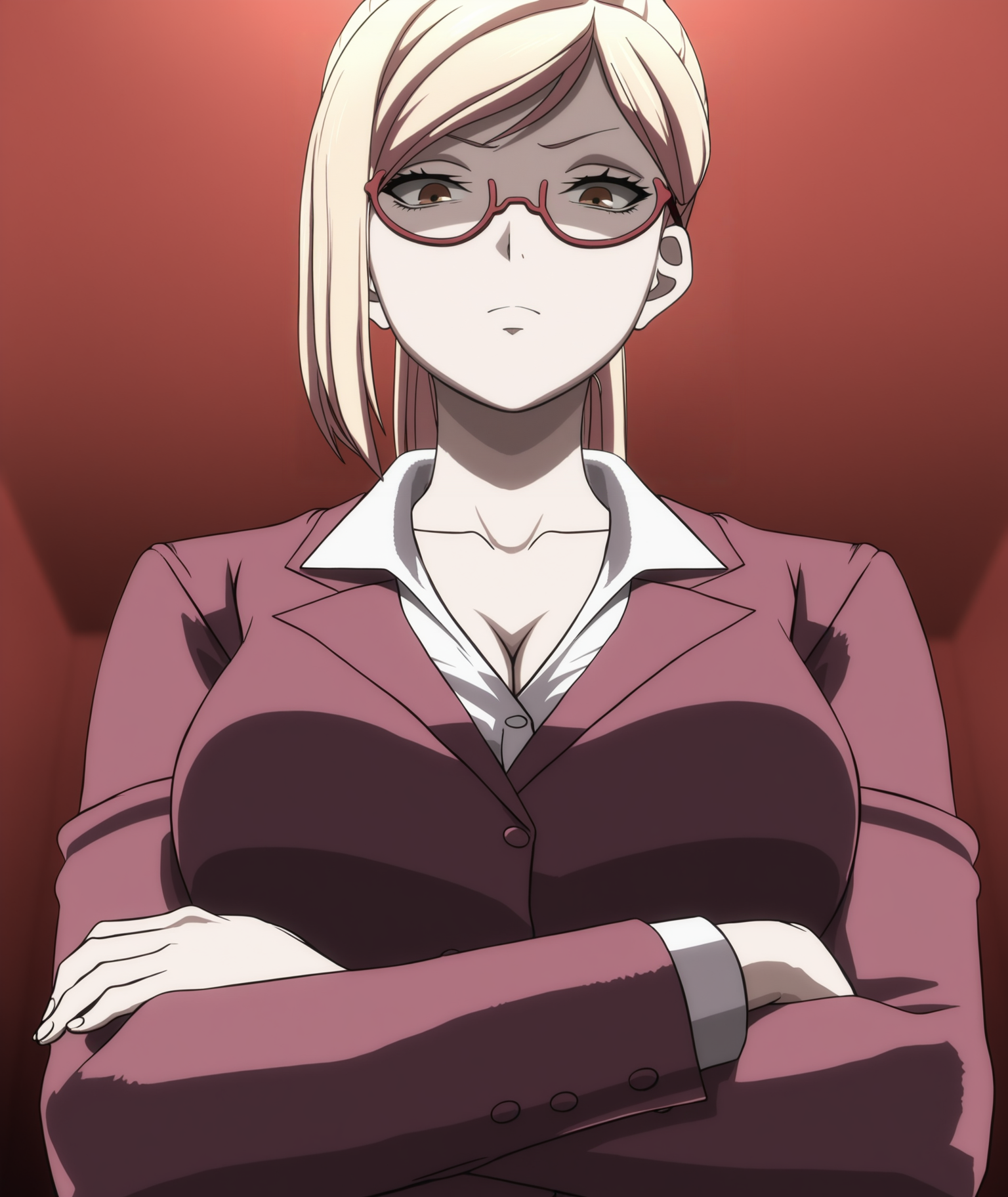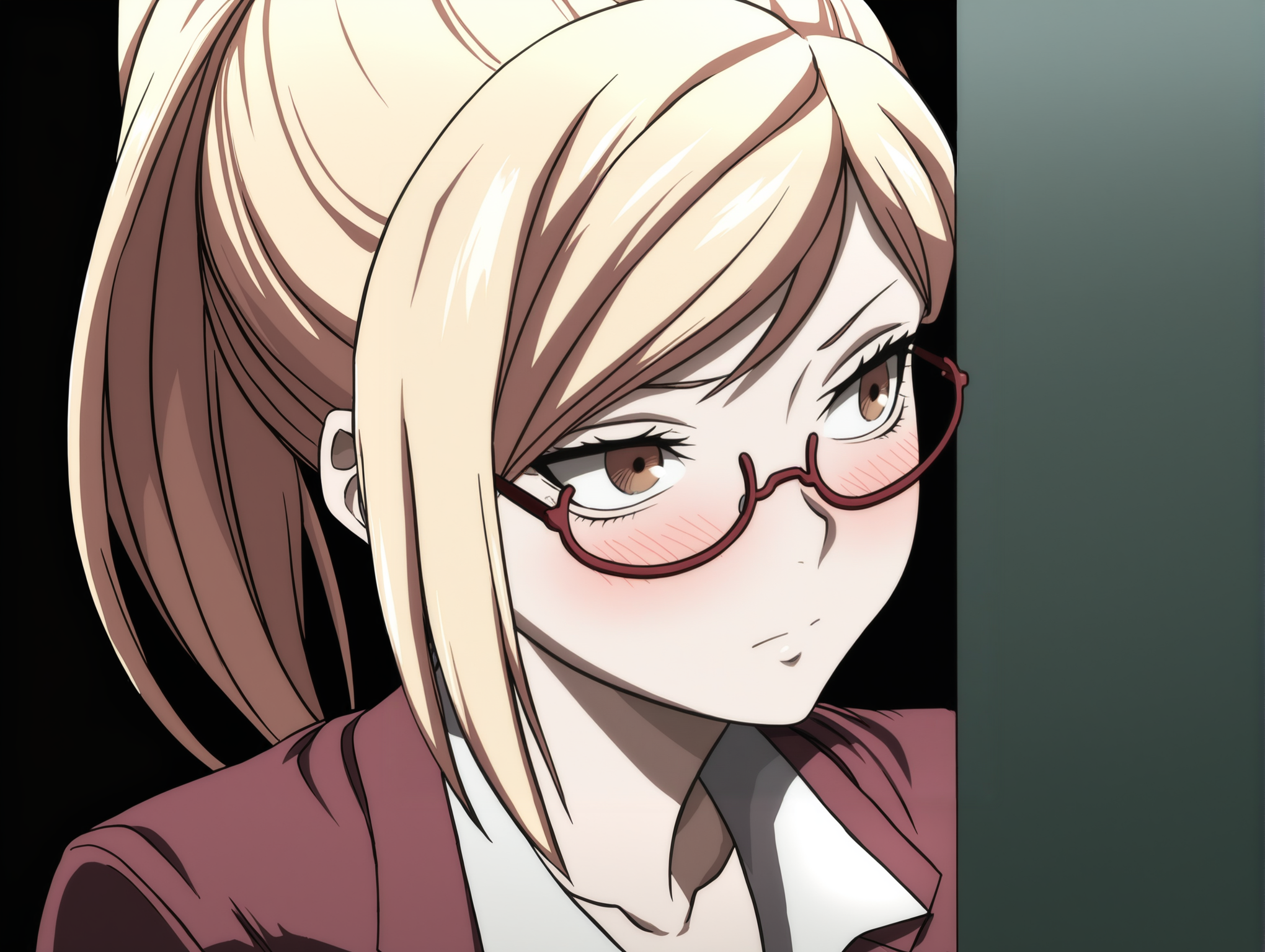 IL_Akiyama Kaede,1girl,solo,glasses,red-framed eyewear,semi-rimless eyewear,under-rim eyewear,breasts,large breasts,cleavage,long hair,high ponytail,blonde hair,swept bangs,brown eyes,eyelashes