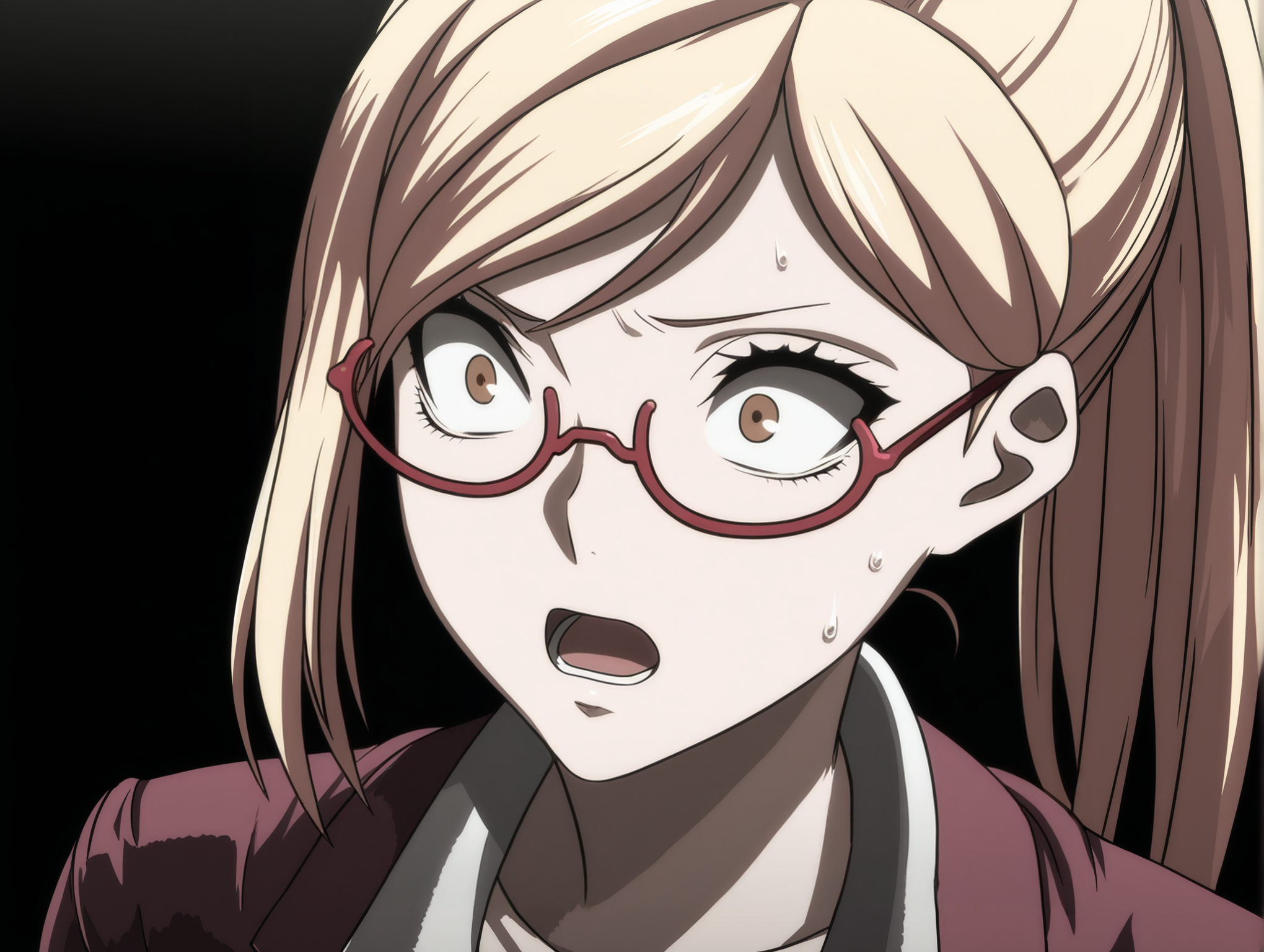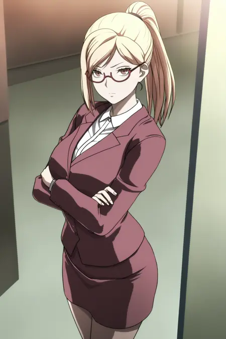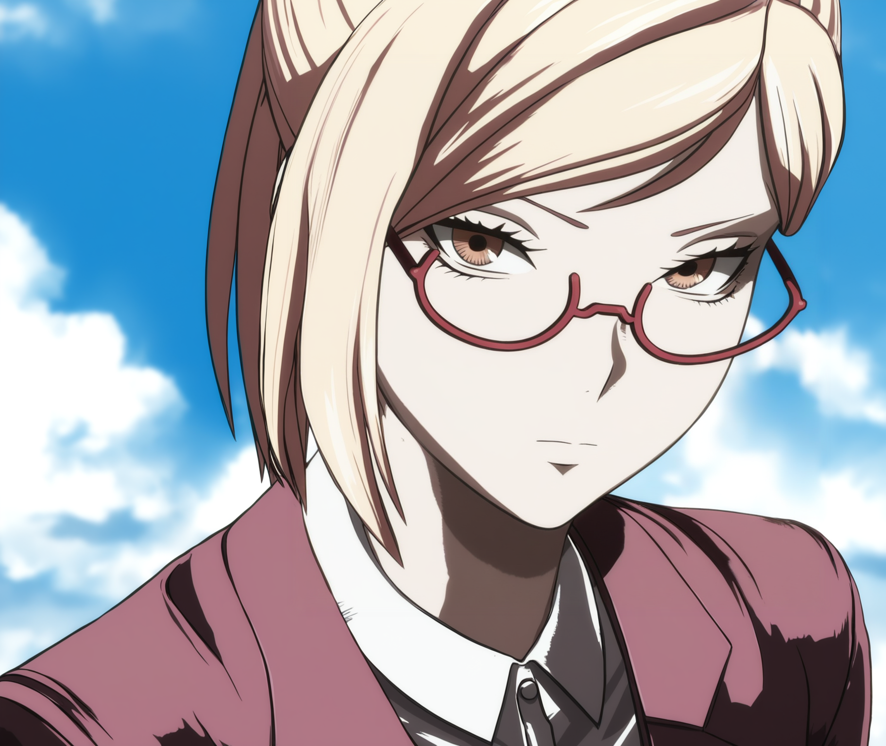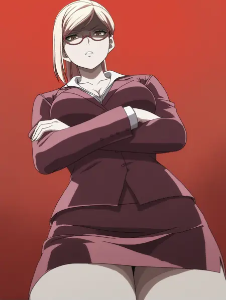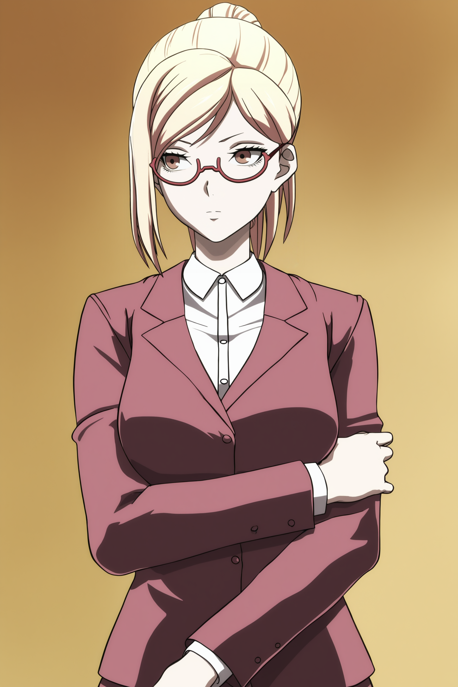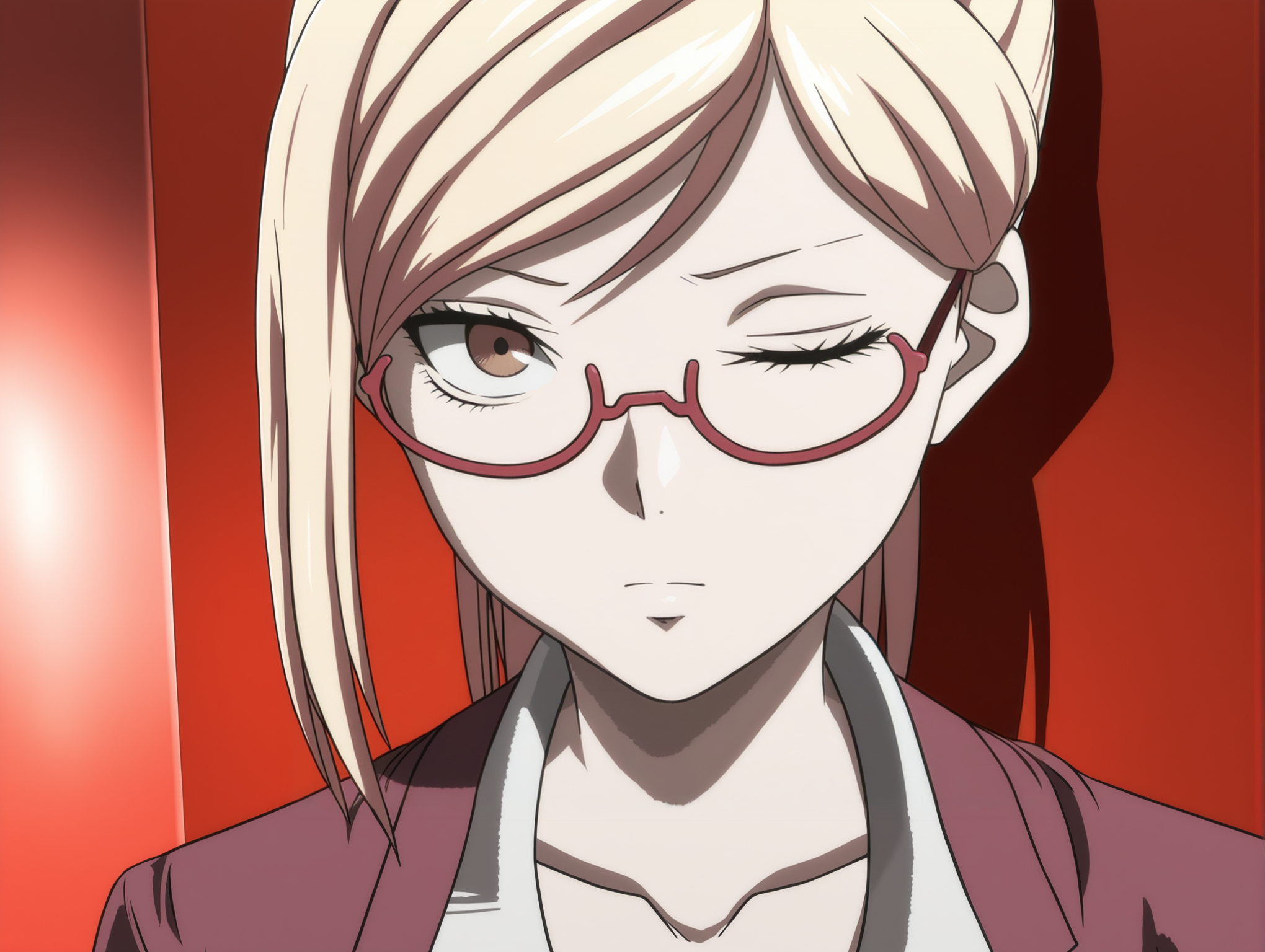 IL_Akiyama Kaede,1girl,solo,glasses,red-framed eyewear,semi-rimless eyewear,under-rim eyewear,breasts,large breasts,cleavage,long hair,high ponytail,blonde hair,swept bangs,brown eyes,eyelashes