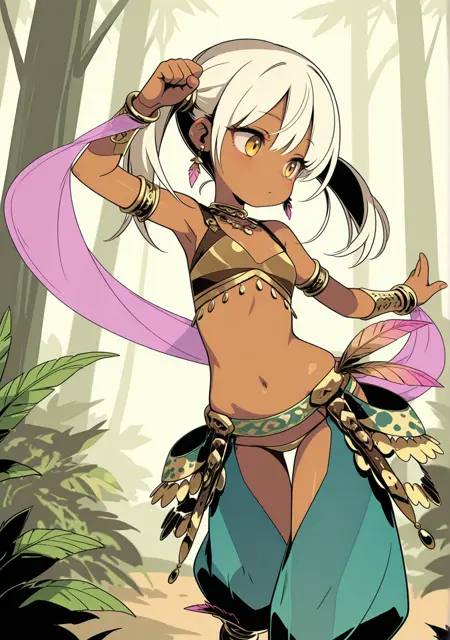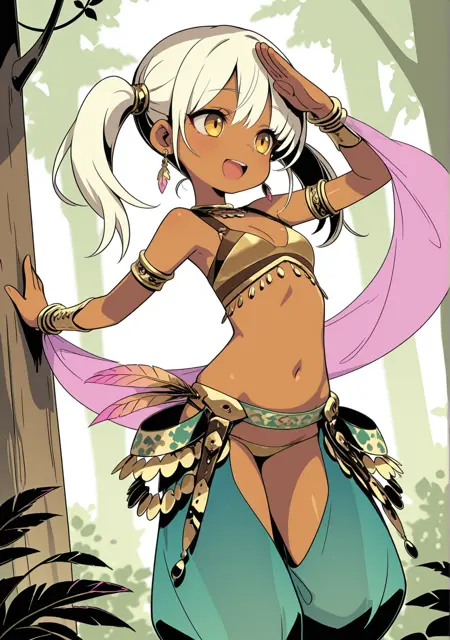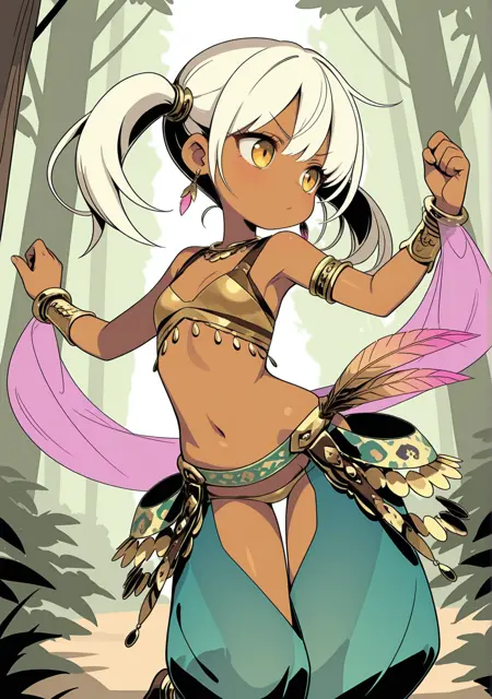 推奨:金髪、黄色い目、濃い肌、濃い肌の女性、長い髪、ツインテール、腹部、へそ、ハーレム衣装、ハーレムパンツ、ローレッグパンティ、チャップス、アームレット、アンクレット、ブレスレット、ブラーサー、イヤリング、羽、ジュエリー、茶色の靴、アラビア風の服、ゆったりしたパンツ、肩出し、緑のパンツ、ネックレス、ふわふわパンツ、透け、太ももカットアウト、
