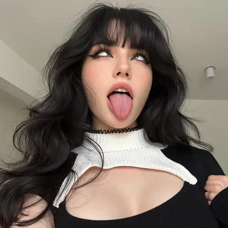 ahegao face. 中距離ショットで、長い波打つ濃い赤髪をした若い女性が描かれている。髪は肩を越えて流れ、上半身の一部を覆っている。彼女の頭は後方および右側に傾けられており、目は上と左を向いている。口は大きく開き、舌が外に伸び、ピンクがかった赤い裏側が見える。目は大きく、明るい色をしており、外眼角から翼のように広がる濃いアイラインが目立つ。左の鼻孔には小さなシルバー色の鼻輪が見える。肌は明るく、首と上半身は露出している。彼女は座っており、左肩の後ろに茶色で質感のある布製のソファの上部が見える。右側には、大きな濃緑色で脈打つような葉の植物が映っている。背景は、濃緑色の縦皺のカーテンである。照明は直接的で正面から当たっており、彼女の顔と上半身を照らしている。