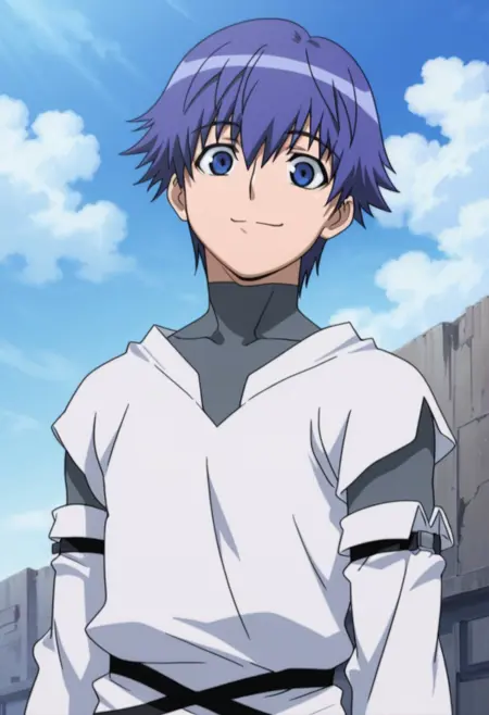 1boy, male focus, solo, blue eyes, blue hair, grey undershirt, turtleneck, white shirt, detached sleeves, black pants,