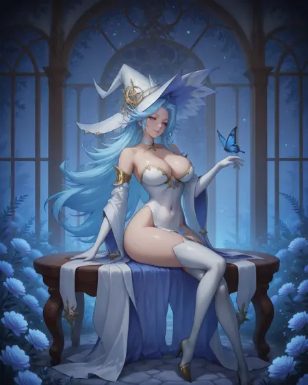 Outfit: witch hat, large hat, cleavage, bare shoulders, armlet, white dress, crescent, covered navel, elbow gloves, white thighhighs, thigh boots, high heels