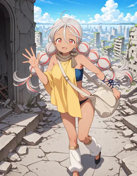 <lora:amoru-towa_no_yuugure_s1-v3-ixl-anime-soralz:1>, amoru (towa no yuugure), 暗色肌の女性、非常に長い髪、灰色の髪、赤髪、ツートーンヘア、ストライプヘア、ツインテール、アホ毛、目の間の髪、赤い目、別 Hairstyle 2