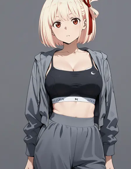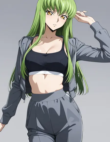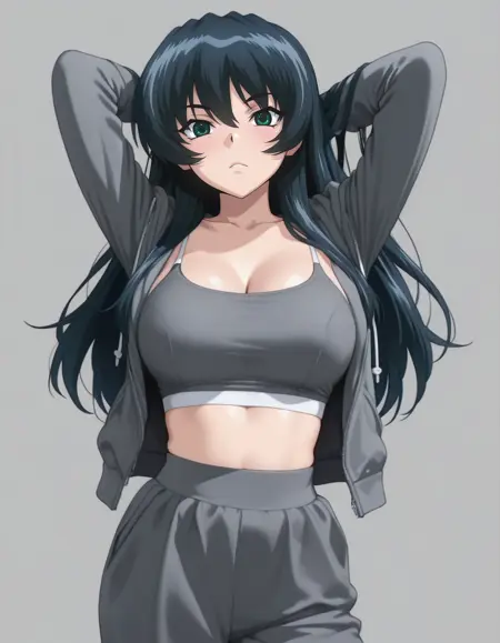 mai_bj_hooded_jacket,hooded_jacket,grey_jacket,open_jacket,crop_top,bra,midriff,track_pants,grey_pants