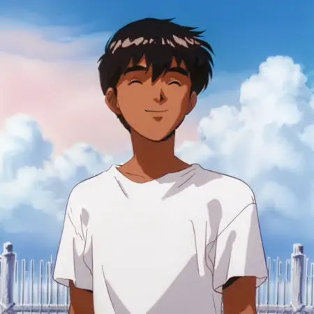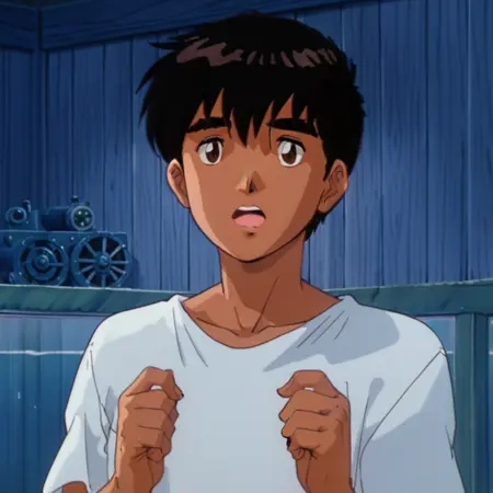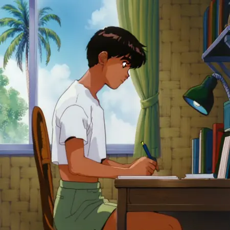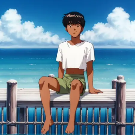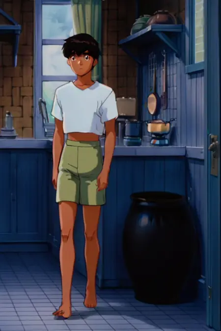 プロンプト:男性、暗い肌、濃い茶色の髪、茶色の目、ショートトップ、短い袖、お腹の部分、緑のショーツ、素足