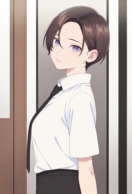• 셔츠를 바지에 넣음, 칼라 셔츠, 반팔, 흰색 셔츠, 검정 넥타이, 검정 치마, 오피스 레이디,