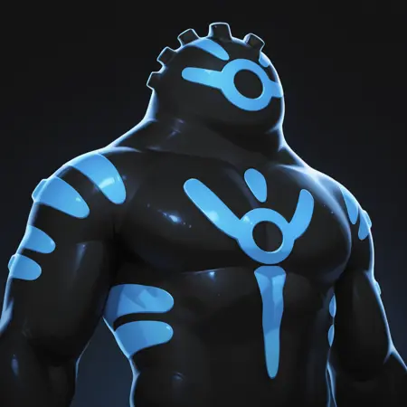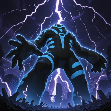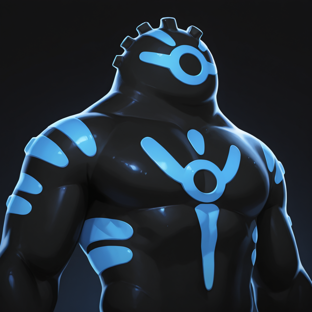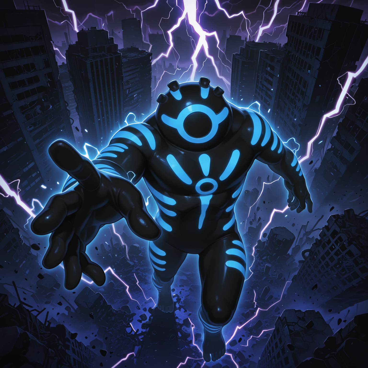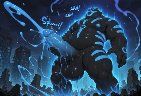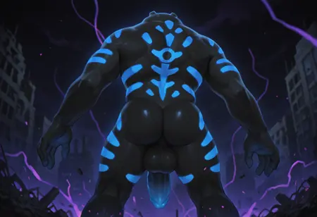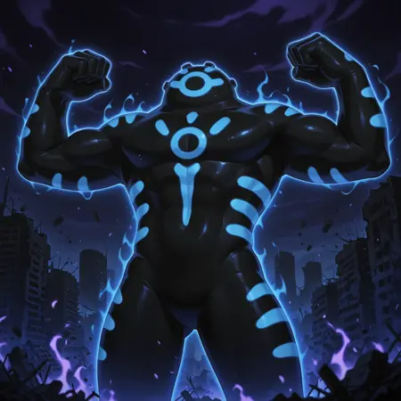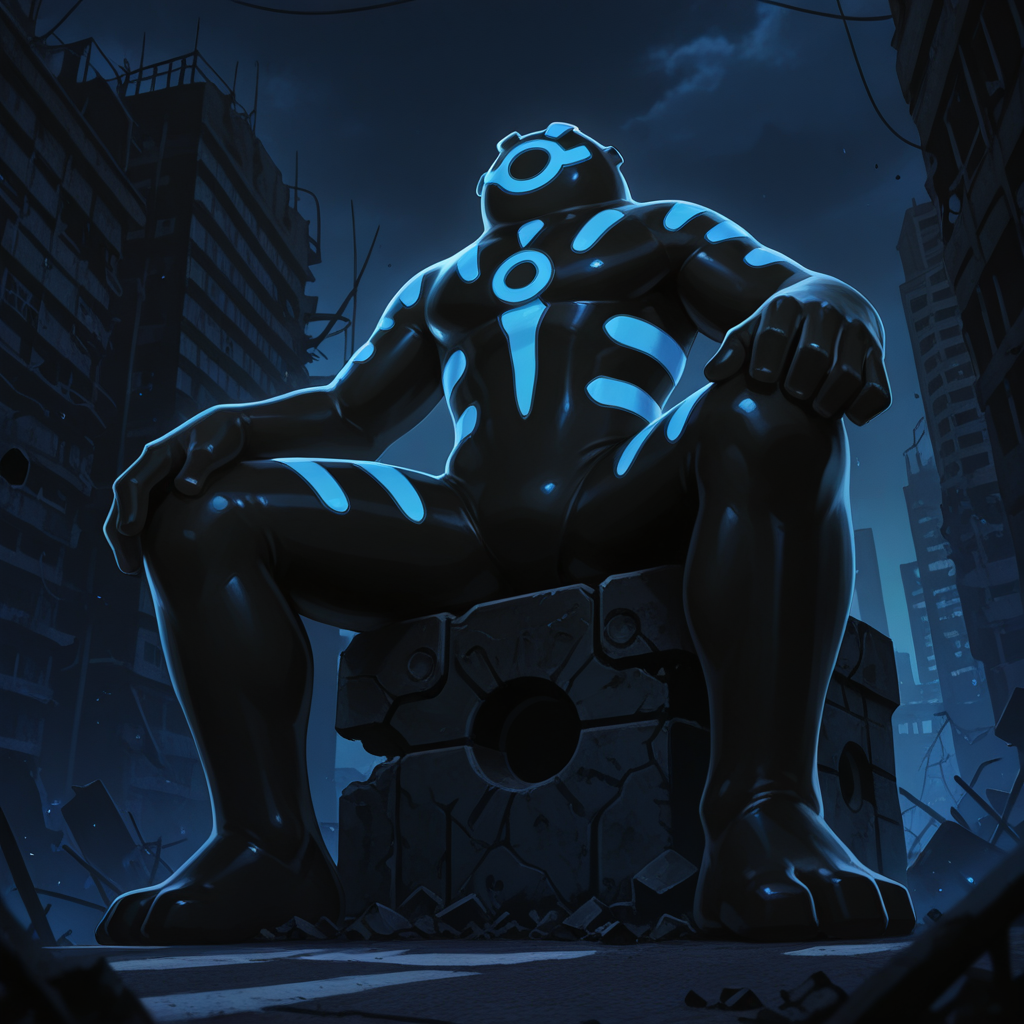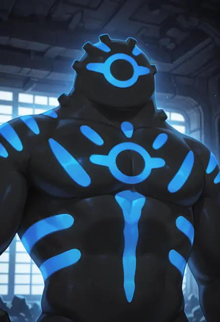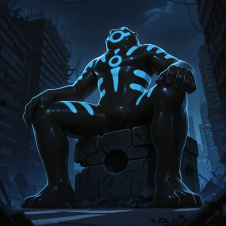 タグ:ゴーレム、黒い肌、巨大、青い模様、目なし、発光する線、巨大、人型、人間なし、青いオーラ