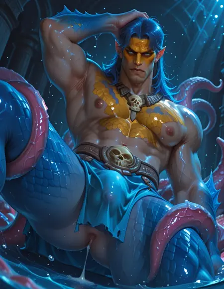 A muscular male, blue skin and scales, yellow tattoos on chest and arms, belt with fish skull head with tassels on his belt, gold face paint on his skin, pink big lips, long elf ears, skeleton bone necklace, blue eyes, front blue cloth Loincloth,
