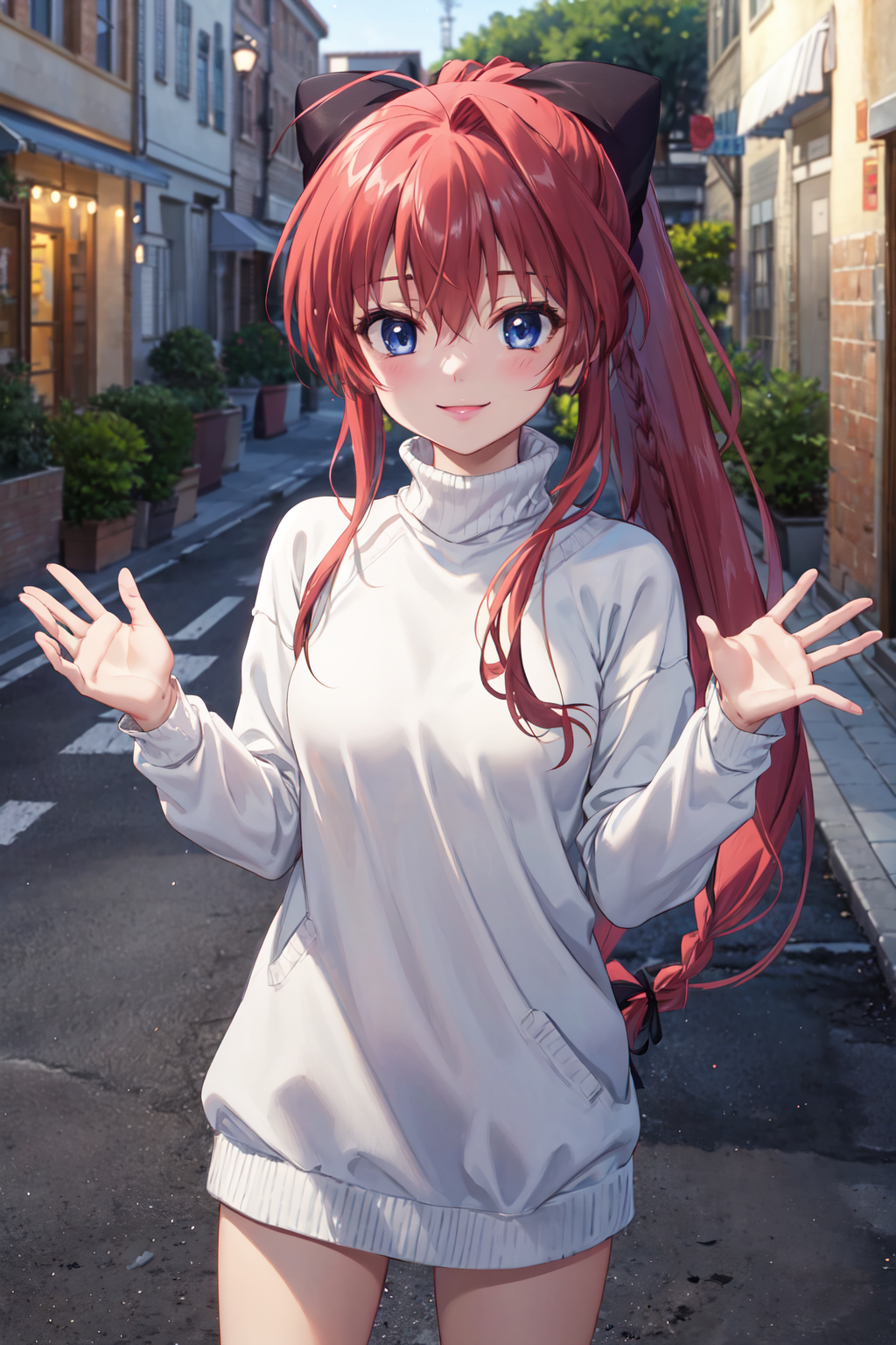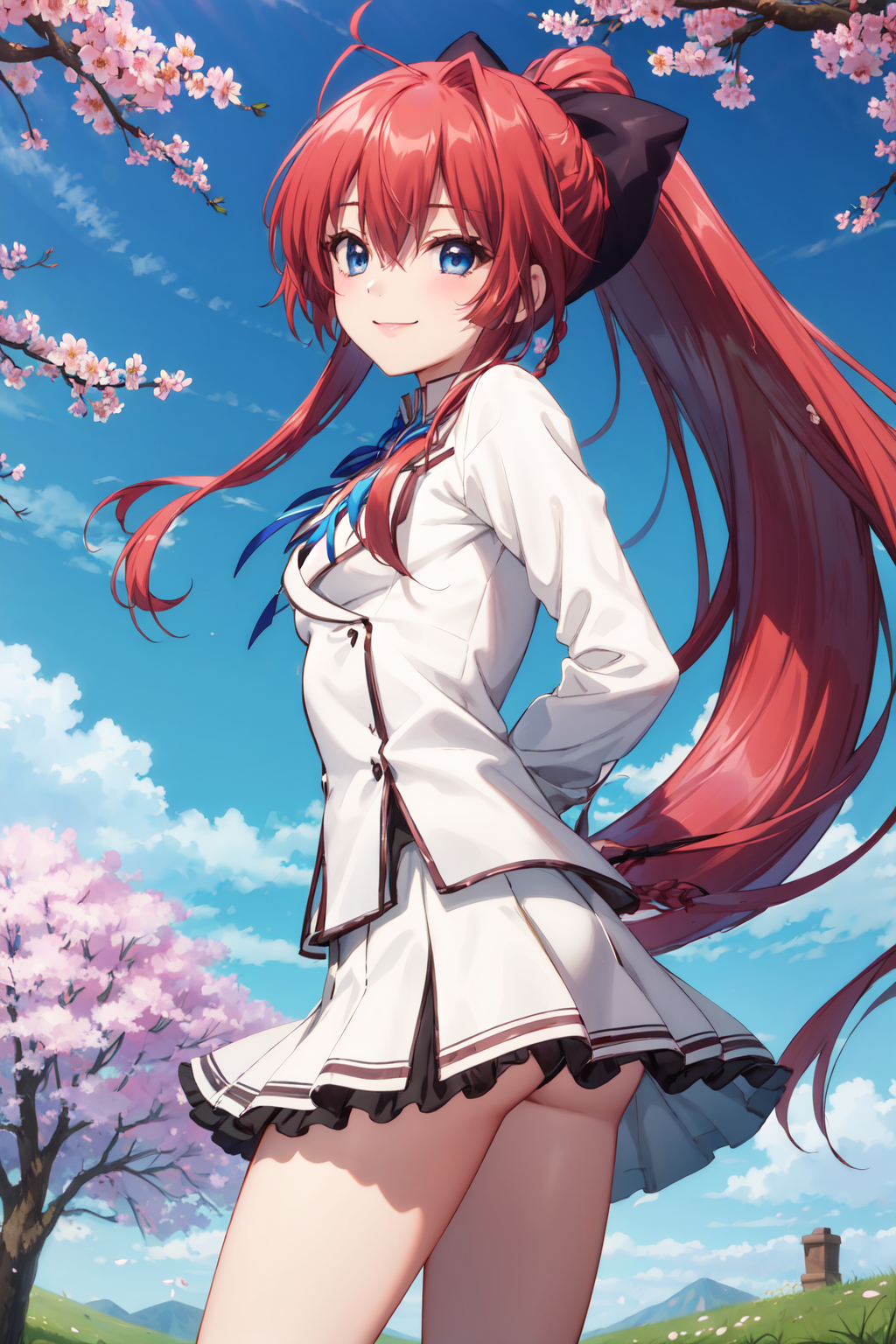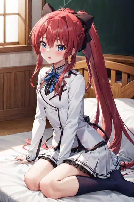 inui sana,blue eyes,long hair,high ponytail,ahoge,braid,hair between eyes,bangs,hair bow,school uniform,neck ribbon,long sleeves,white jacket,collared shirt,juliet sleeves,white skirt,(black socks:1.2),(kneehighs:1.2),loafers