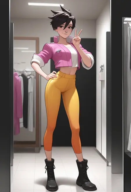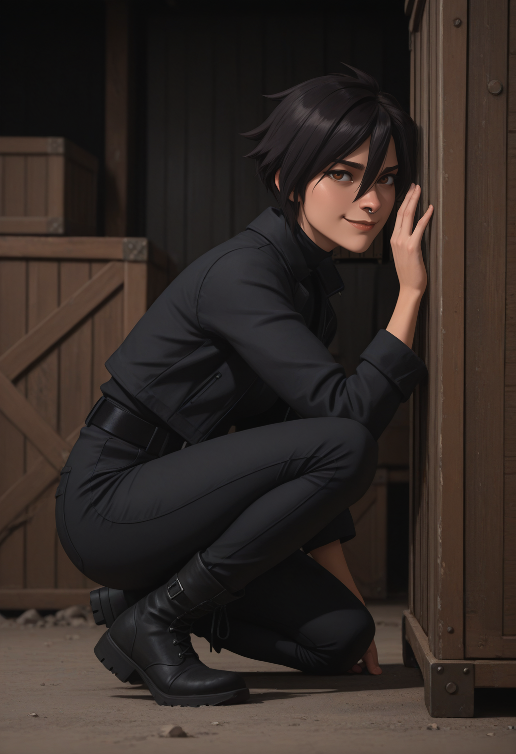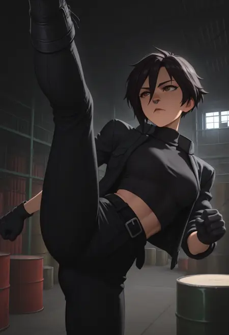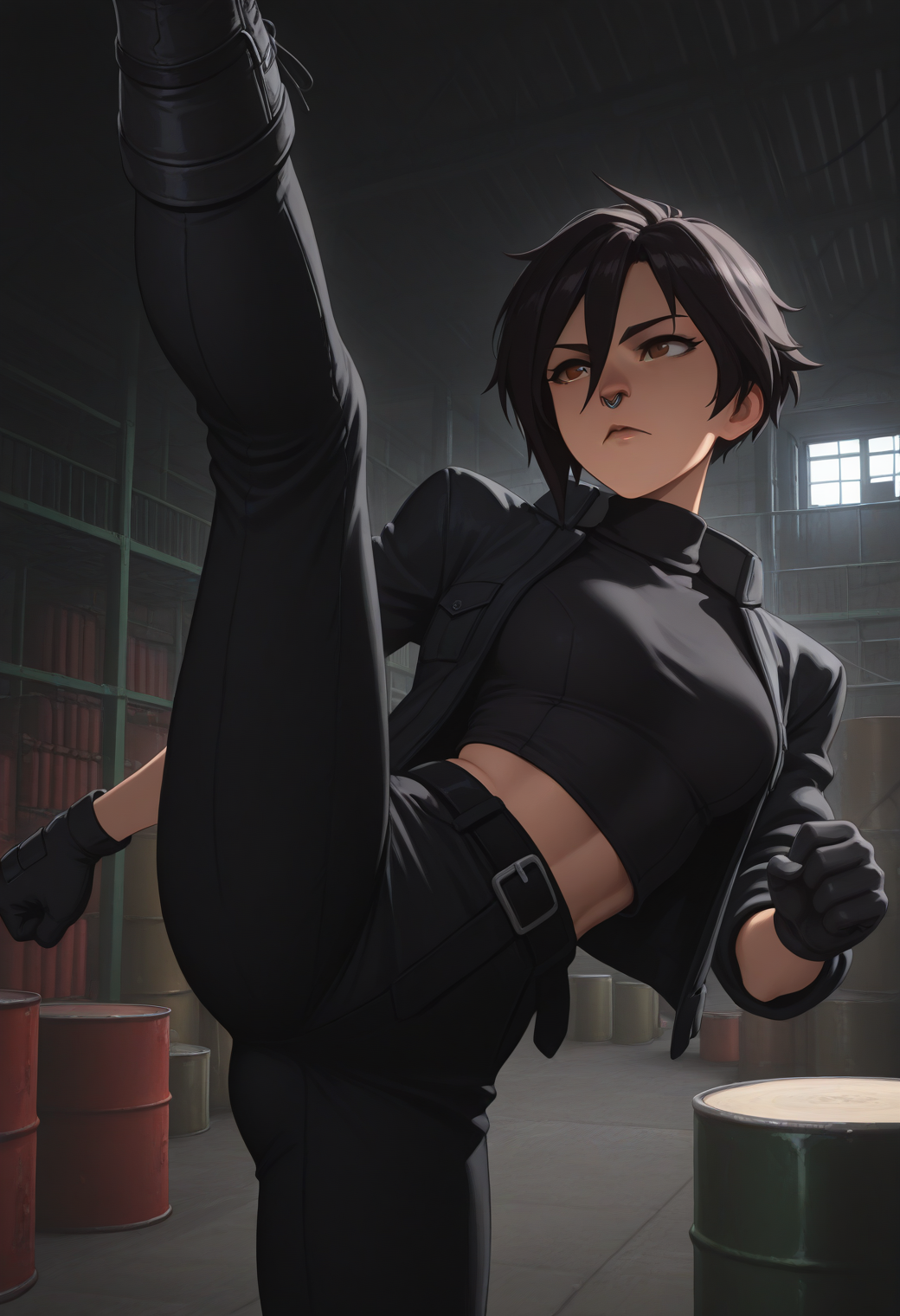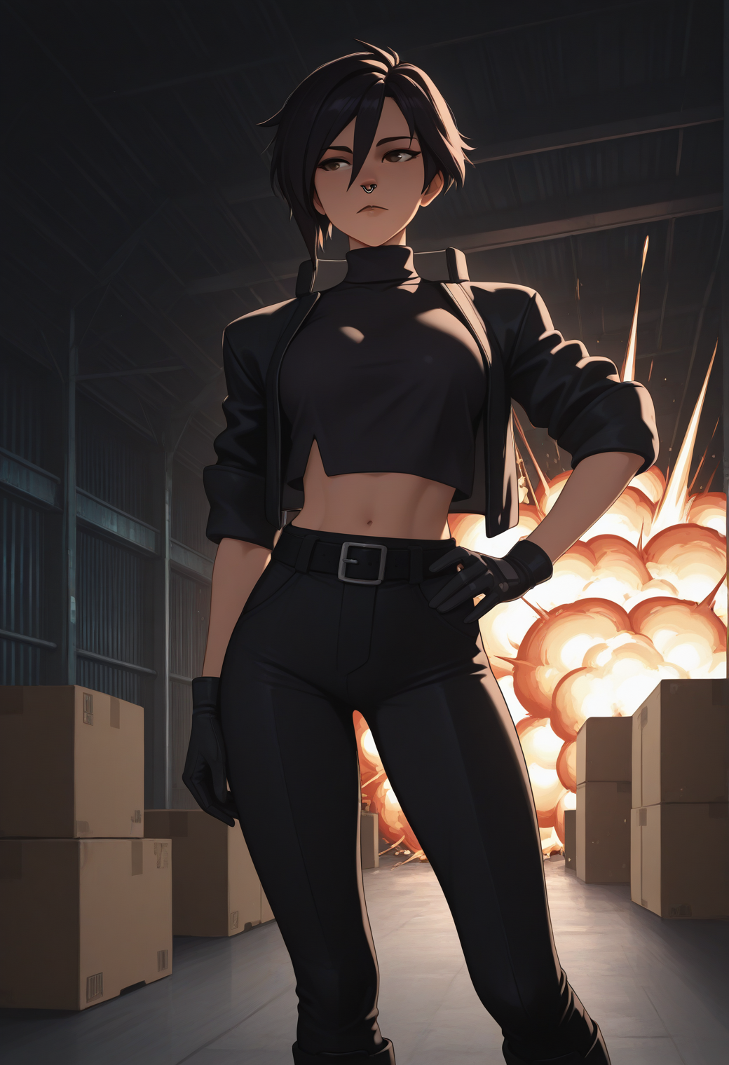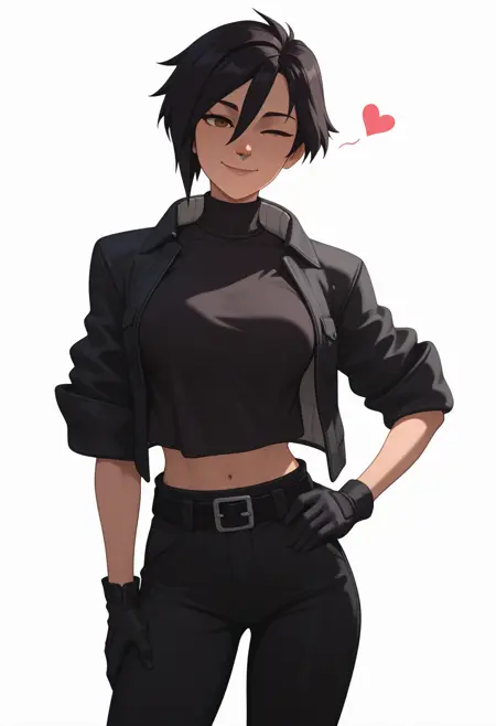 Invisibitch tags: "open jacket, black jacket, black belt, black shirt, turtleneck, midriff, black pants, black gloves, boots"