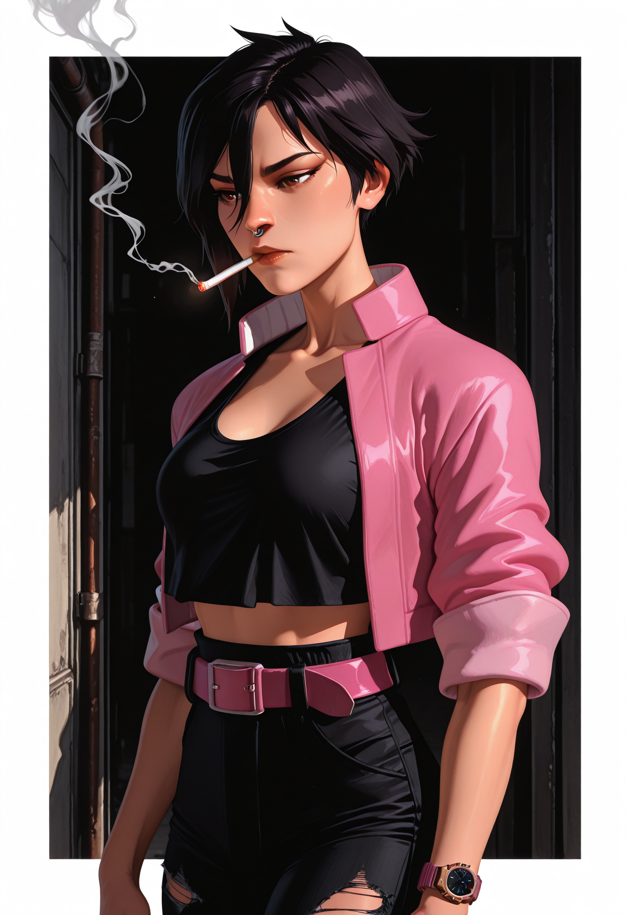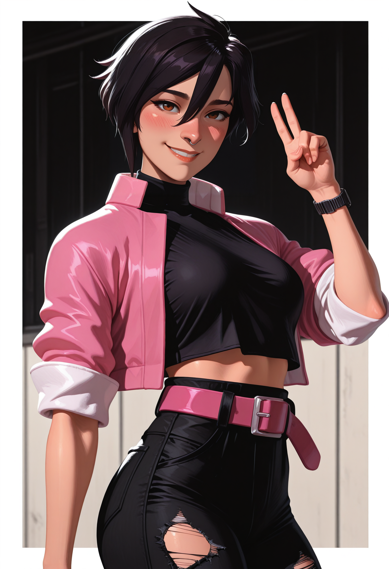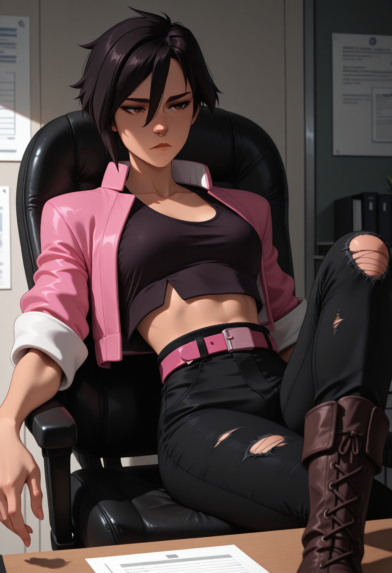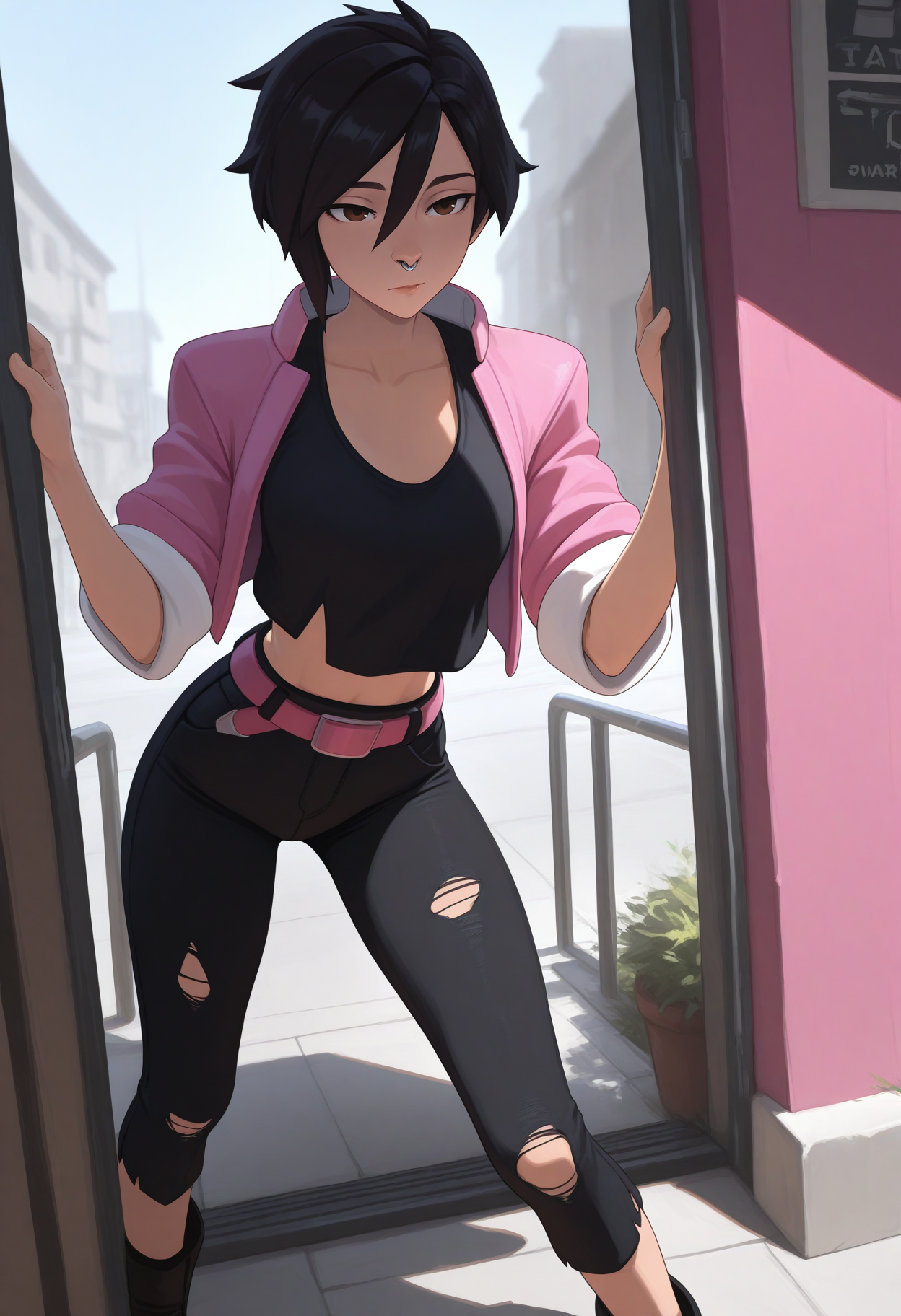 Invisigal tags: "pink jacket, cropped jacket, open jacket, black crop top, midriff, navel, capri pants, torn pants, pink belt, wristwatch, boots"