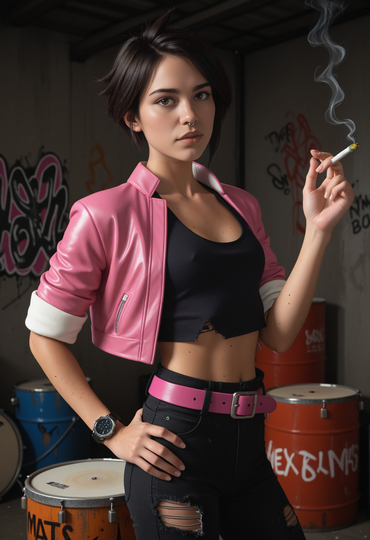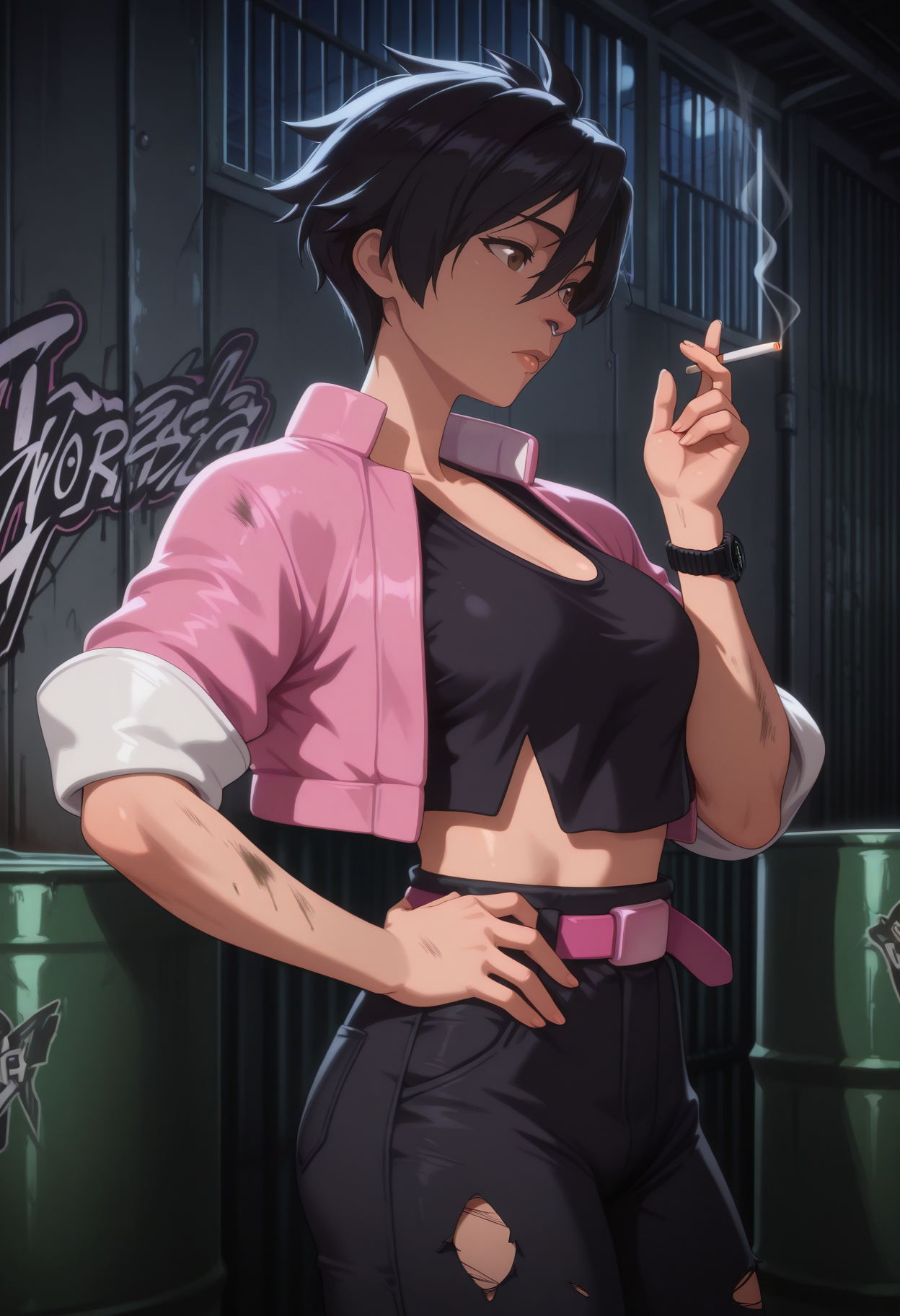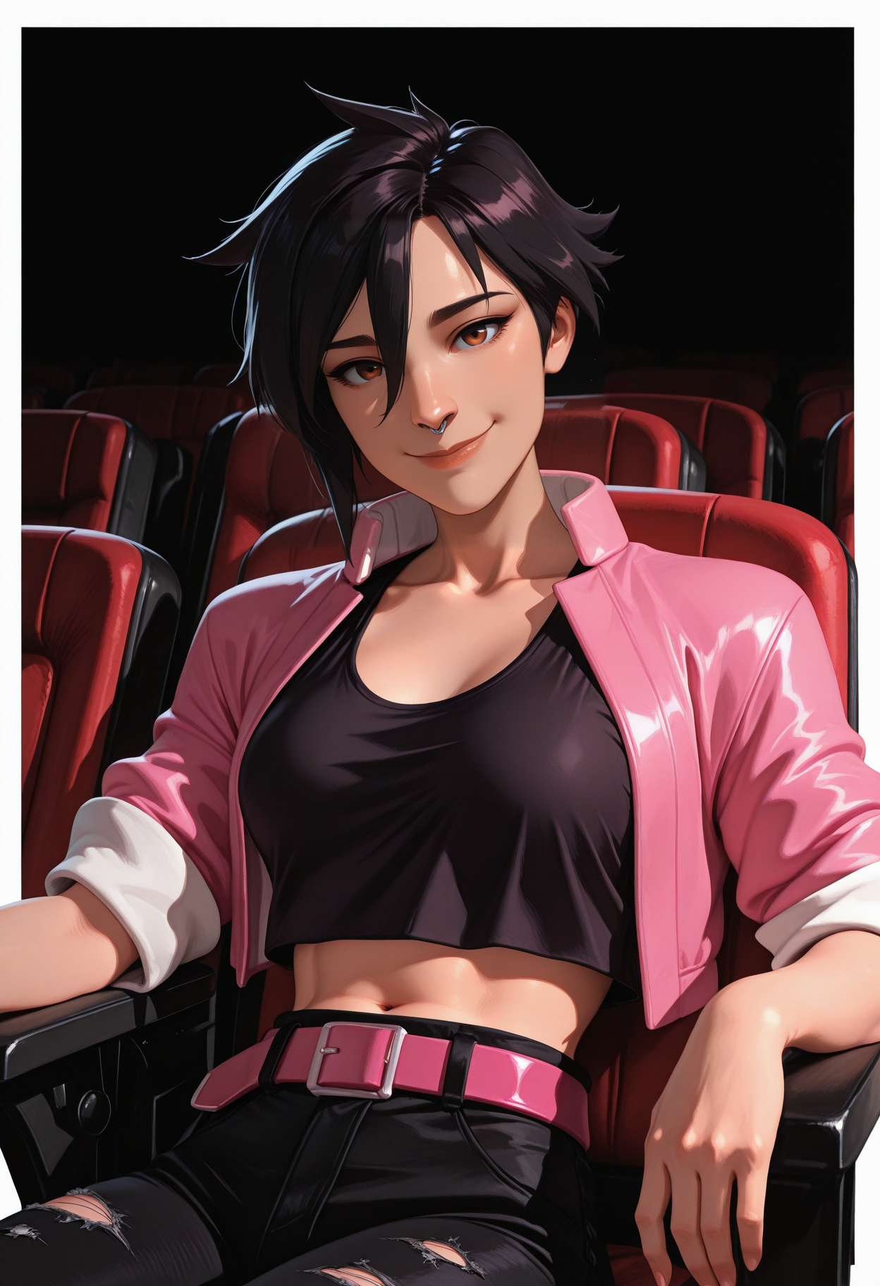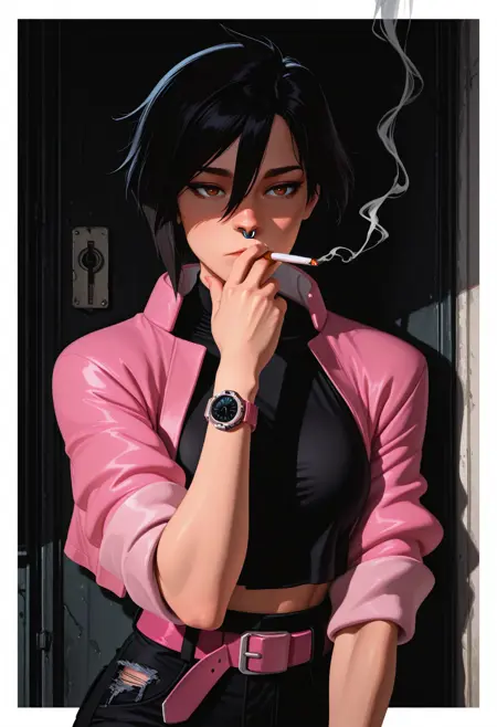 Invisigal tags: "pink jacket, cropped jacket, open jacket, black crop top, midriff, navel, capri pants, torn pants, pink belt, wristwatch, boots"