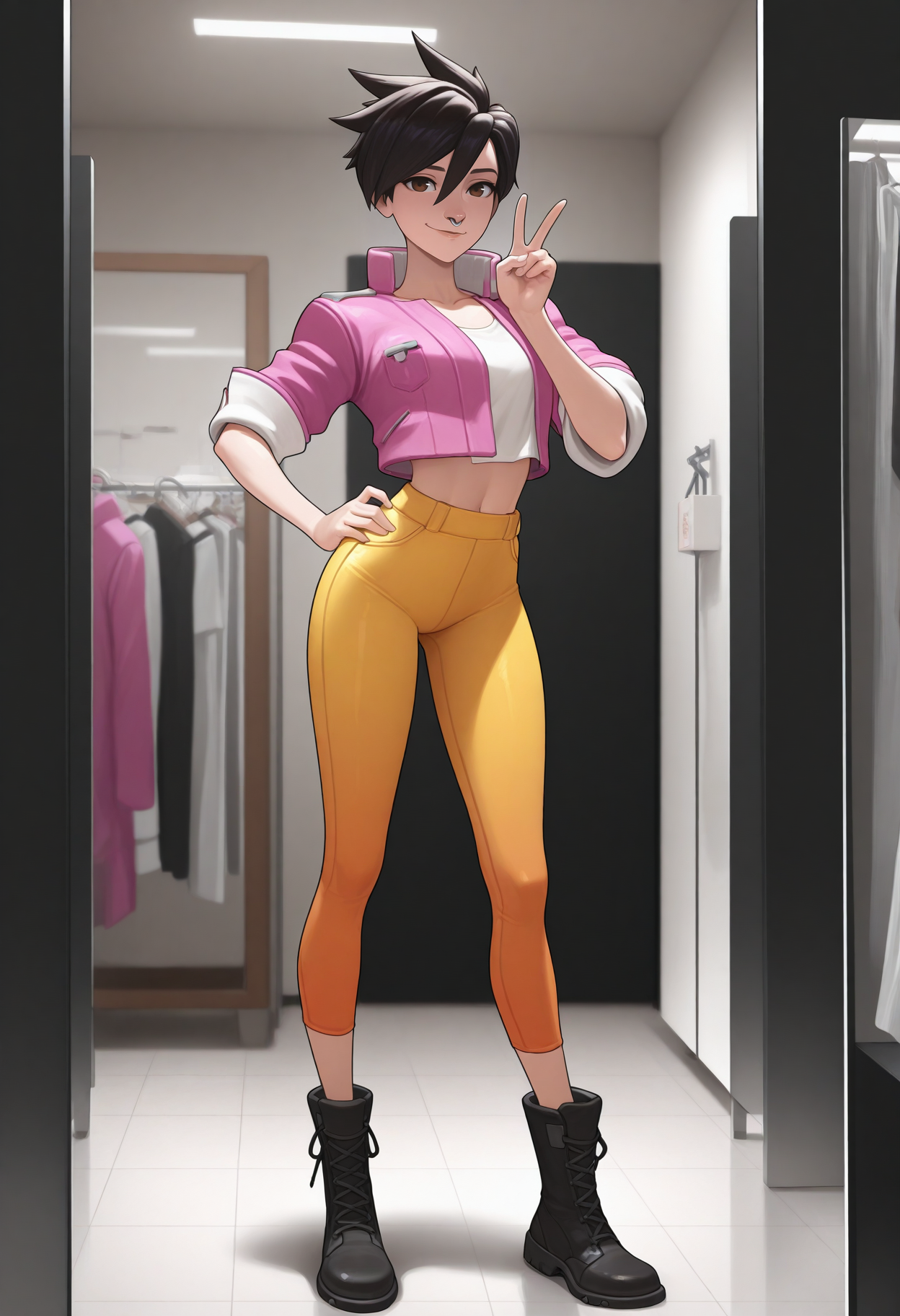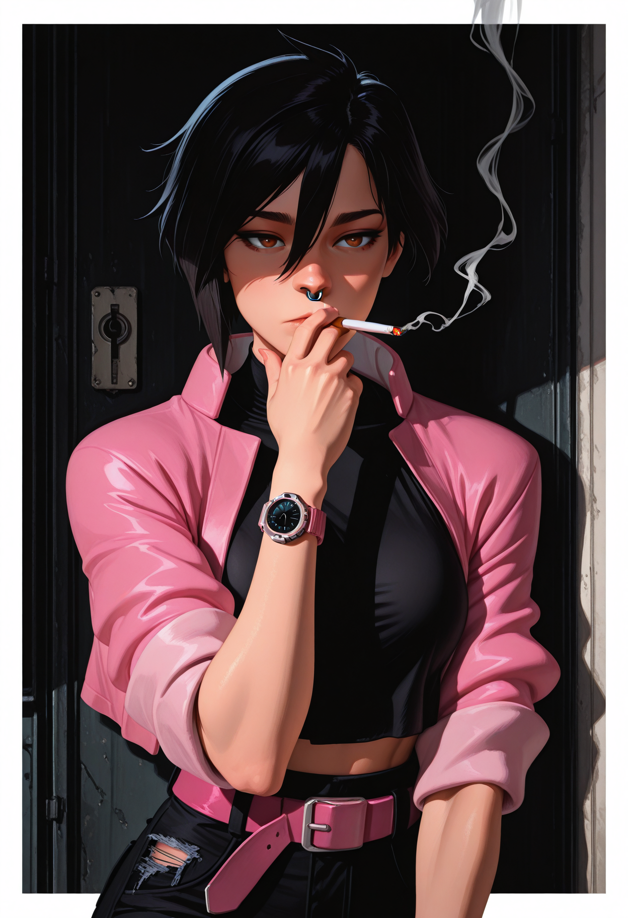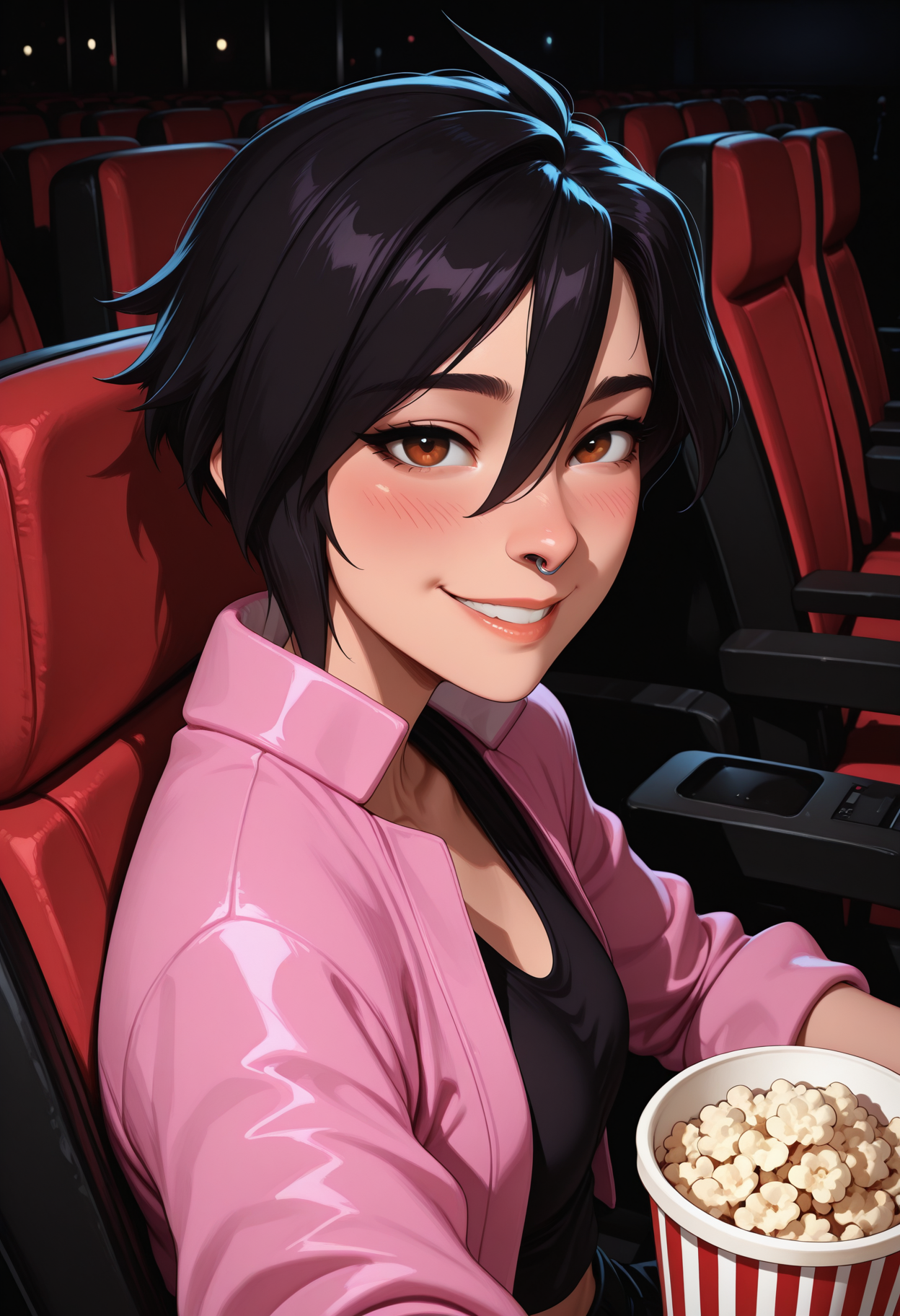 Main tags: "v1s1, black hair, short hair, hair between eyes, brown eyes, nose ring"