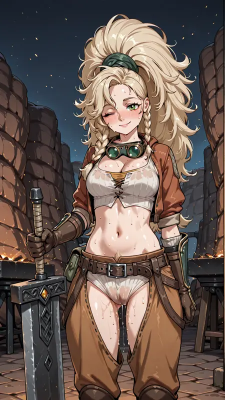 GemmaMHW, 1girl, ponytail, side braid, big hair, goggles around neck,