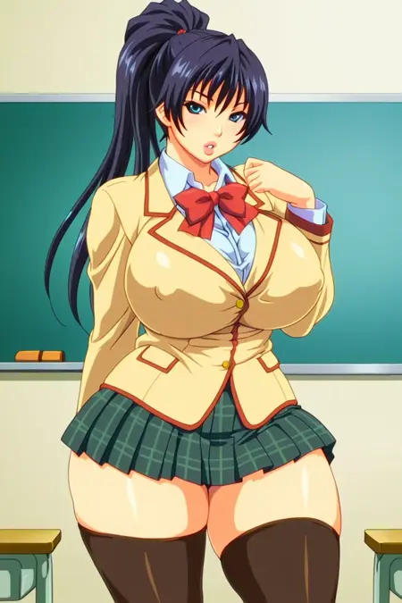 1girl, Sanae (Aneki), long hair, ponytail, black hair, blue eyes, glossy lips, thick lips, HD, 8k, superb quality, high-resolution, clear animation, uncensored
